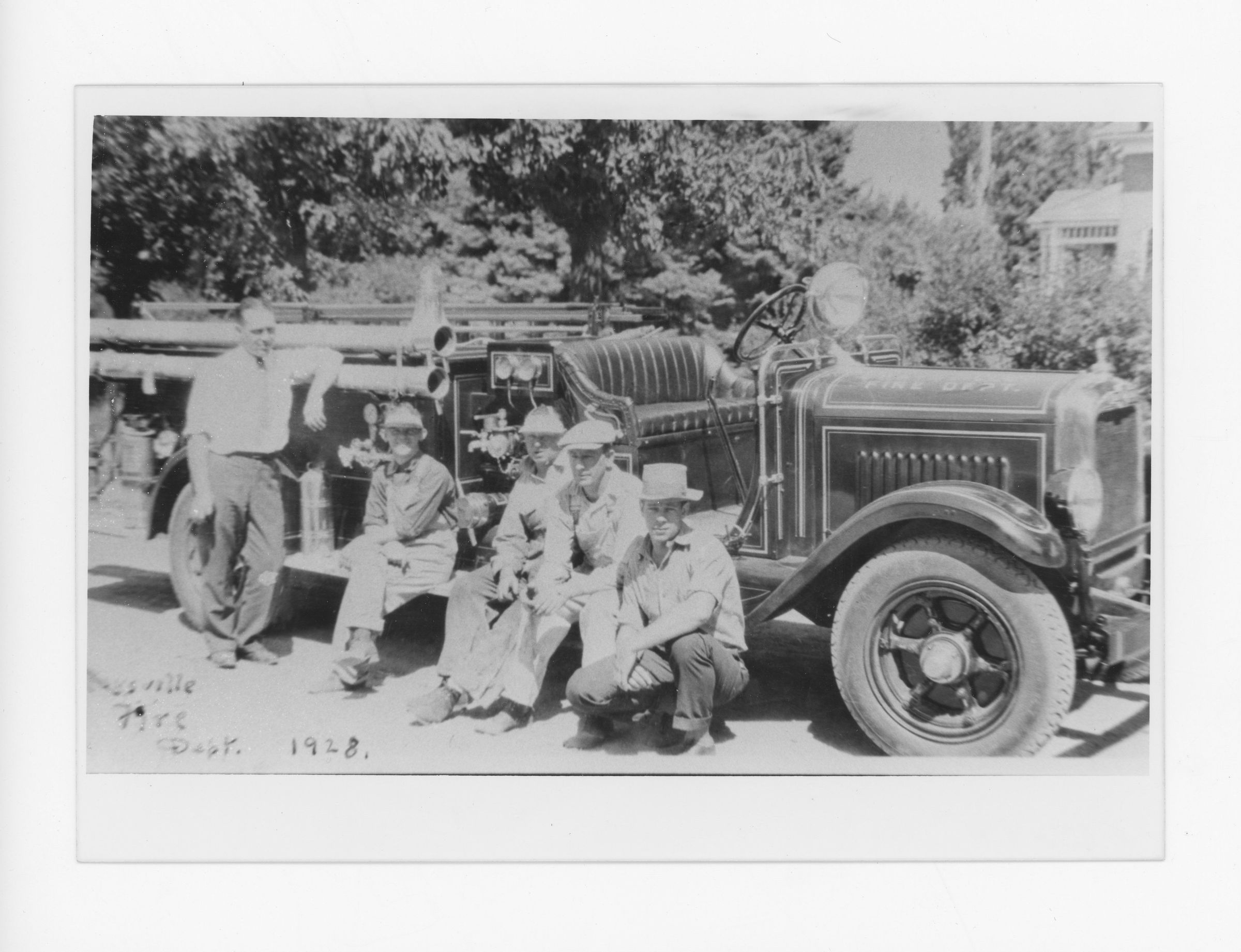 Kaysville's first fire truck (Kaysville Our Town book). From left to right: Elburn Chipman, Kenneth Sheffield, Shirley Ball, Jack Birgance Sr., Siril Davis.