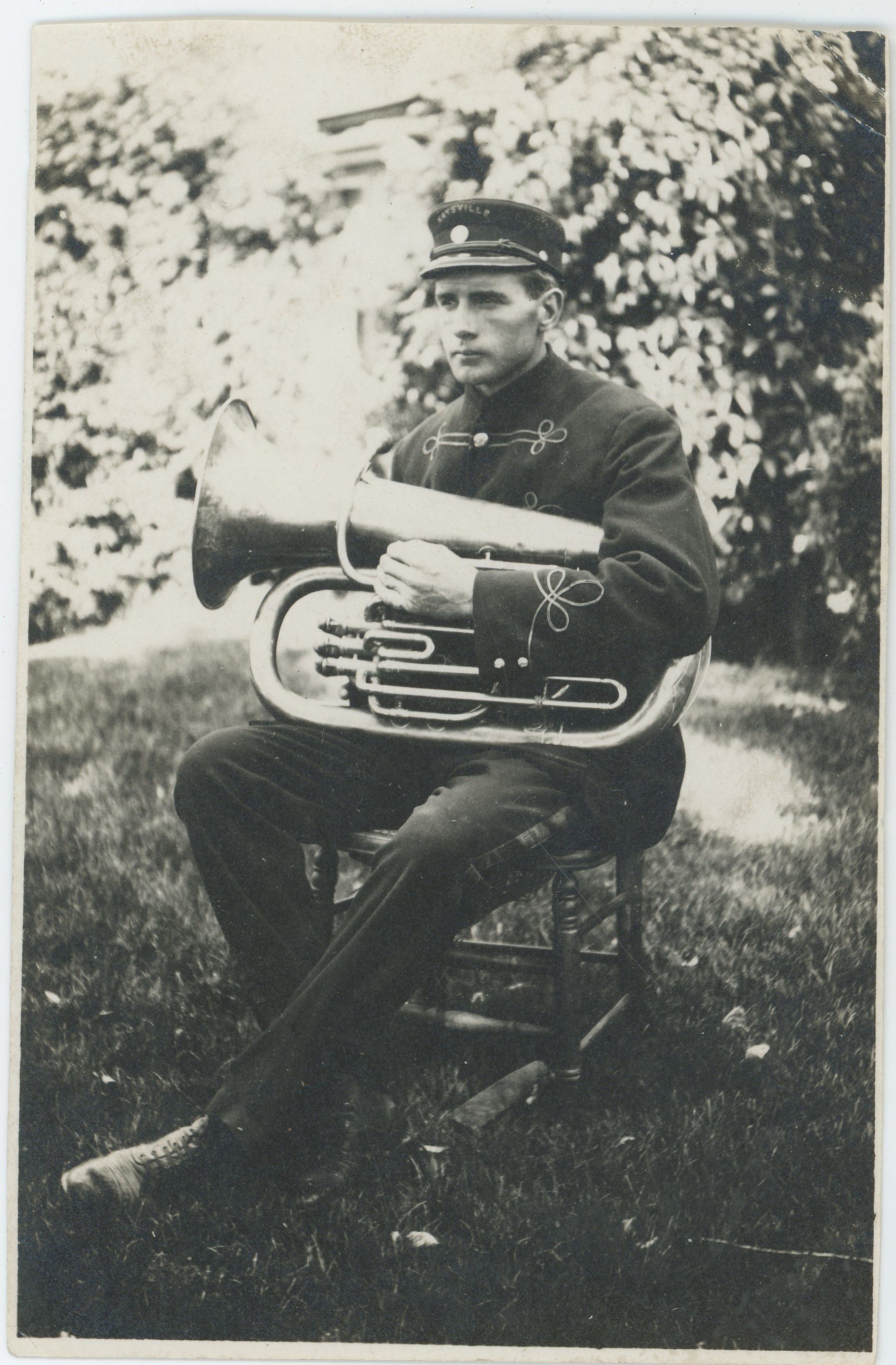 Kaysville Brass Band member, Albert Beazer Barton, seated, holding tuba instrument.Photograph Details