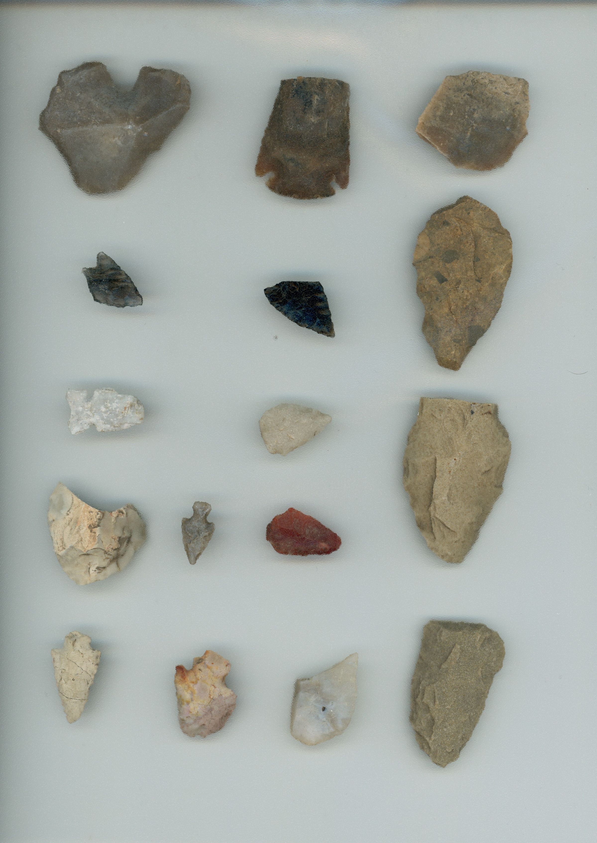 Indigenous hunting tools include arrowheads and pieces. An arrow shaft straightening stone is seen in the upper left corner. Scraping tools are seen in the column on the right side.Context