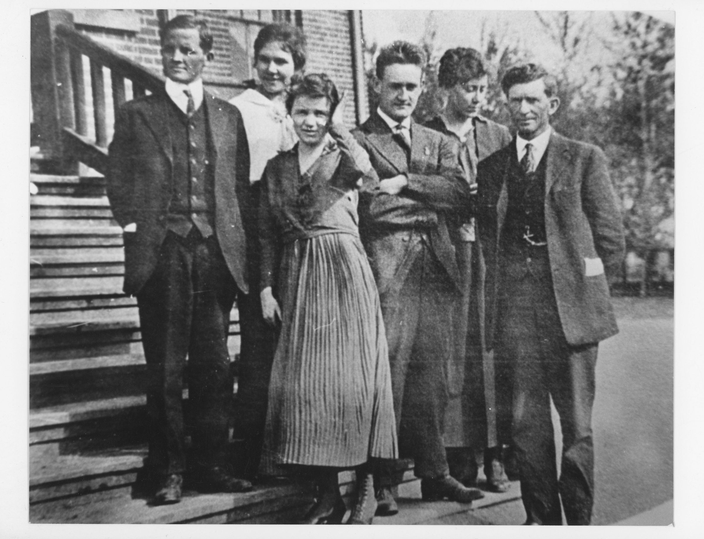 Left to right: Leon Strong, Garnet Swan, Nora Blamires, LeConte Stewart, Olive Abrams, E.M. Whitesides (principal). This picture was taken on the front steps of the 1905 school building.Collection
