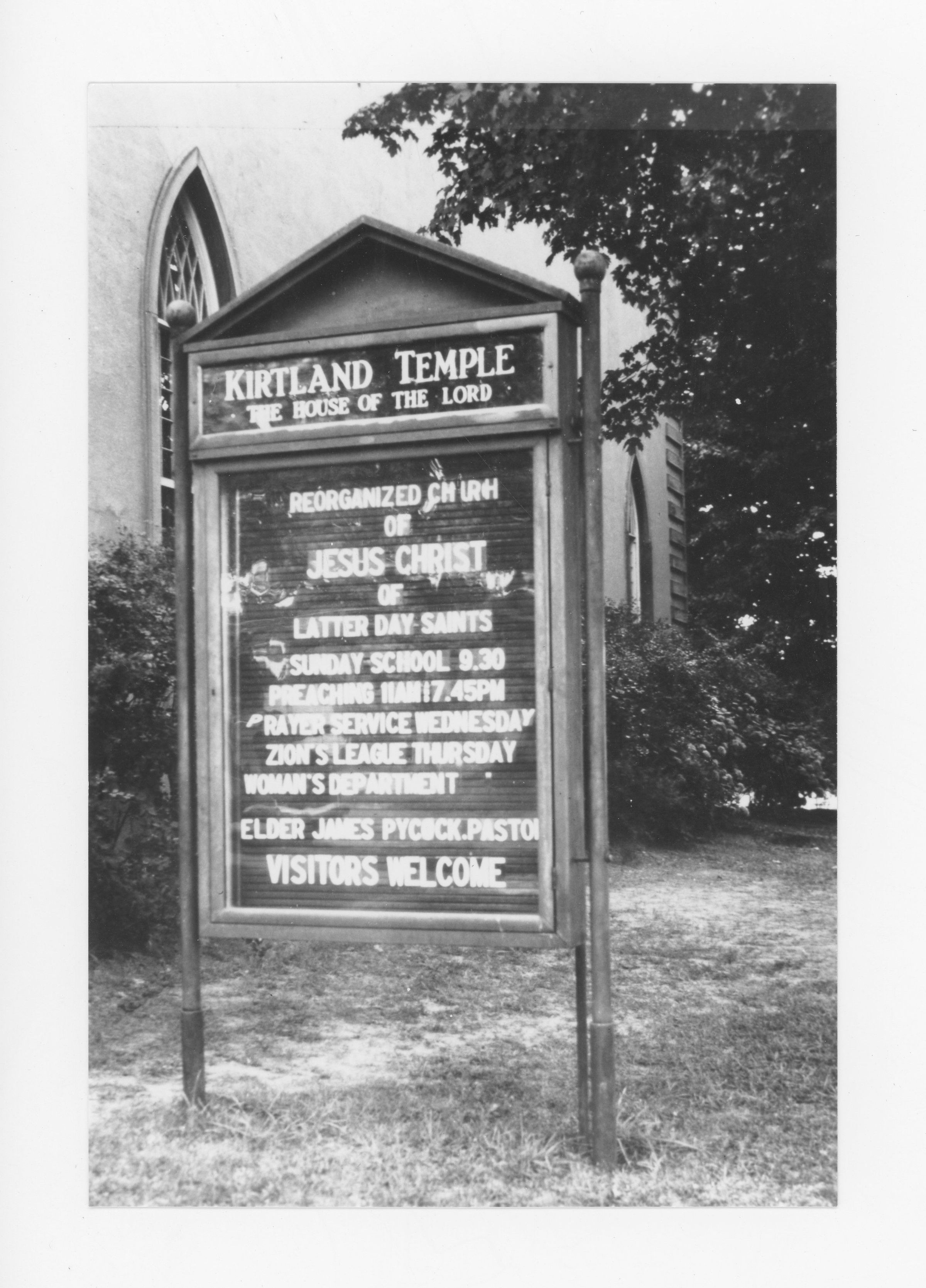 Schedule and welcome sign outside of the Kirtland Temple.Context