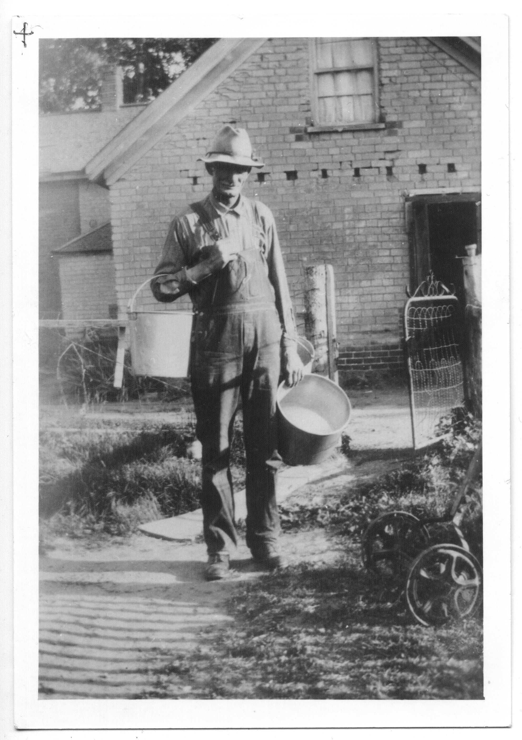 Rosel Hyde, Junior, carrying milking pails at the old Hyde pioneer farm in north Kaysville.Photograph Details