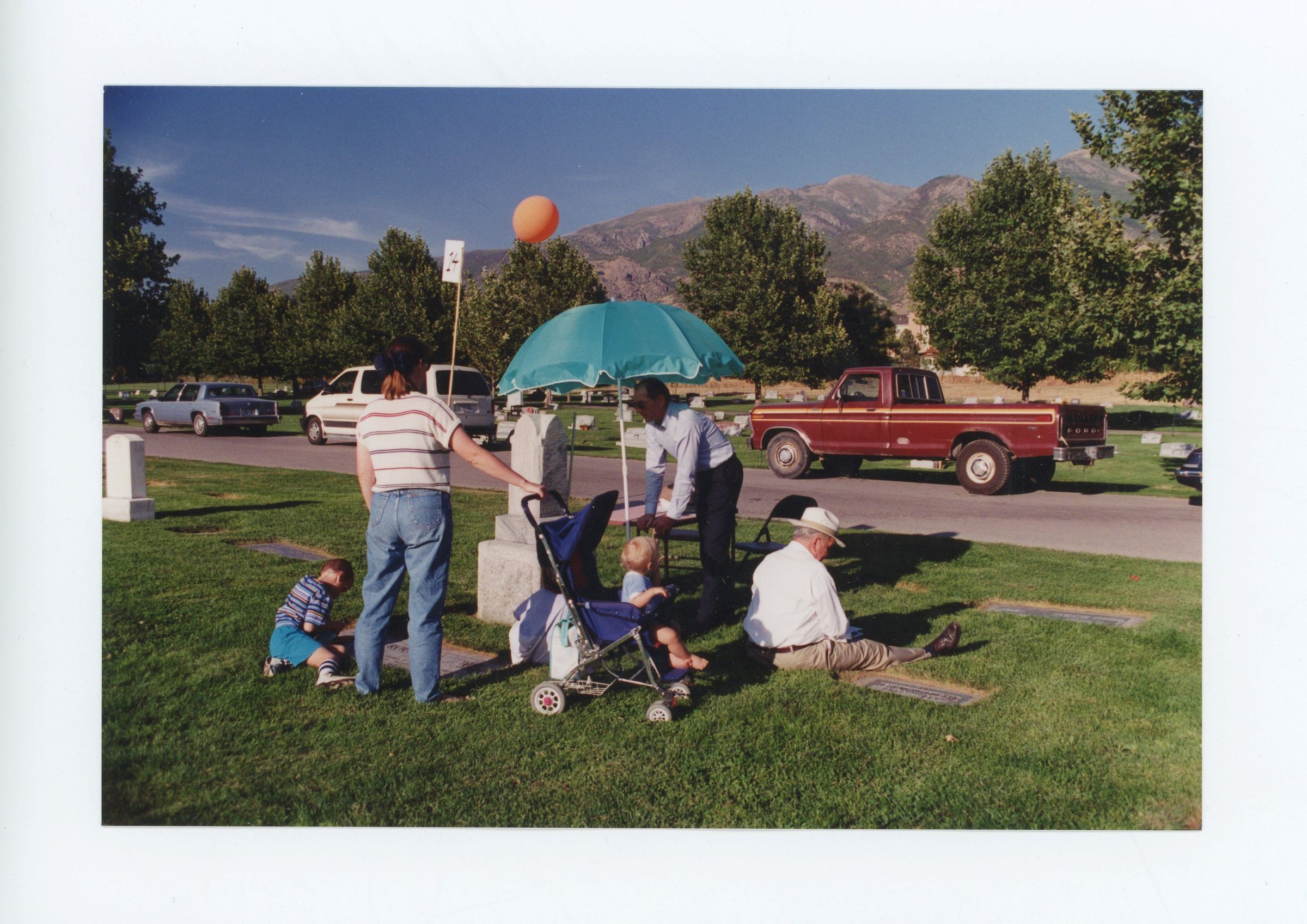 Kaysville - Fruit Heights Utah Centennial Celebration. People next to gravestones in Kaysville Cemetery prepare for tour.Photograph Details