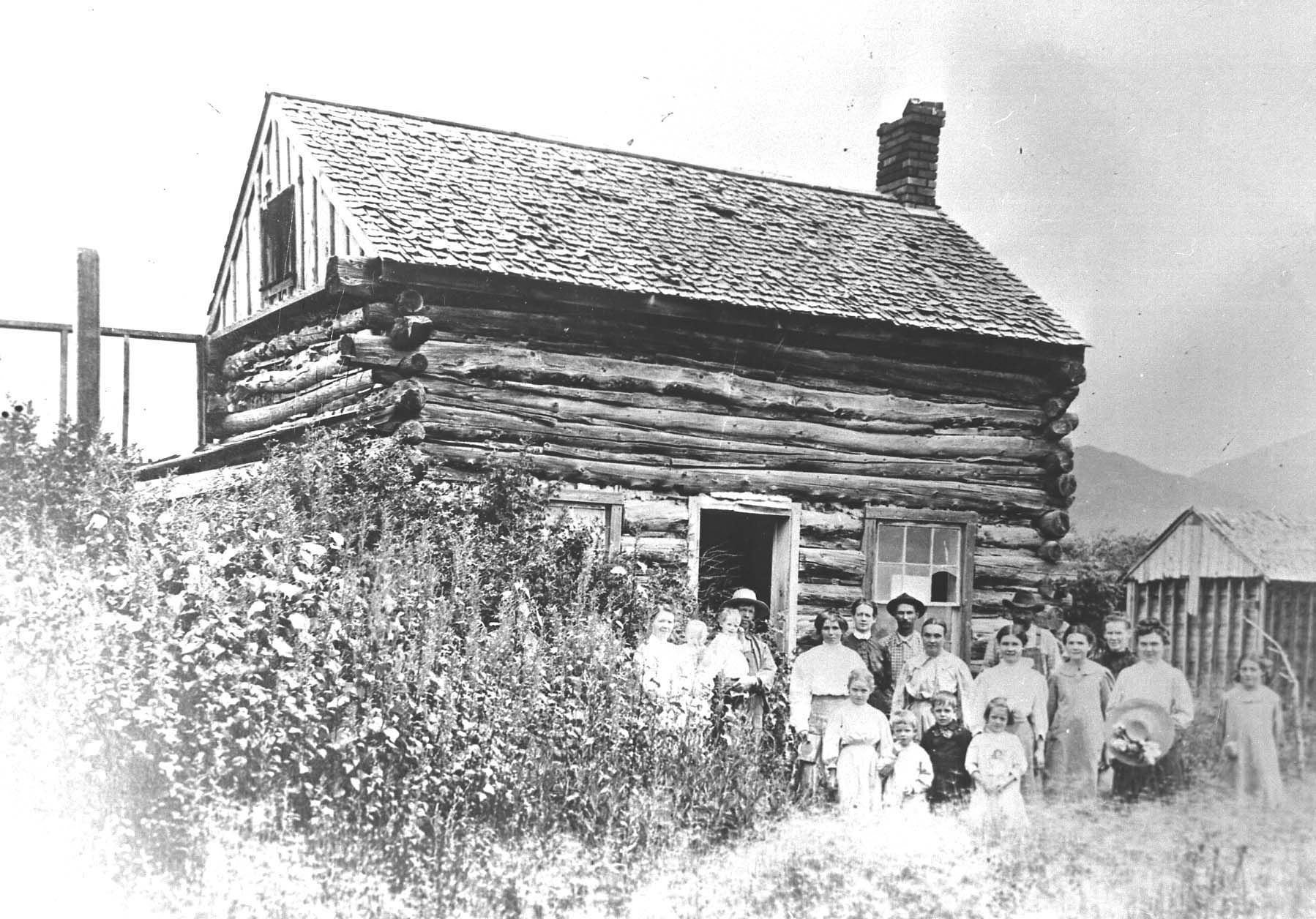 Samuel Rushforth family standing in front of two-story cabin they used as a home after settling in Kaysville.