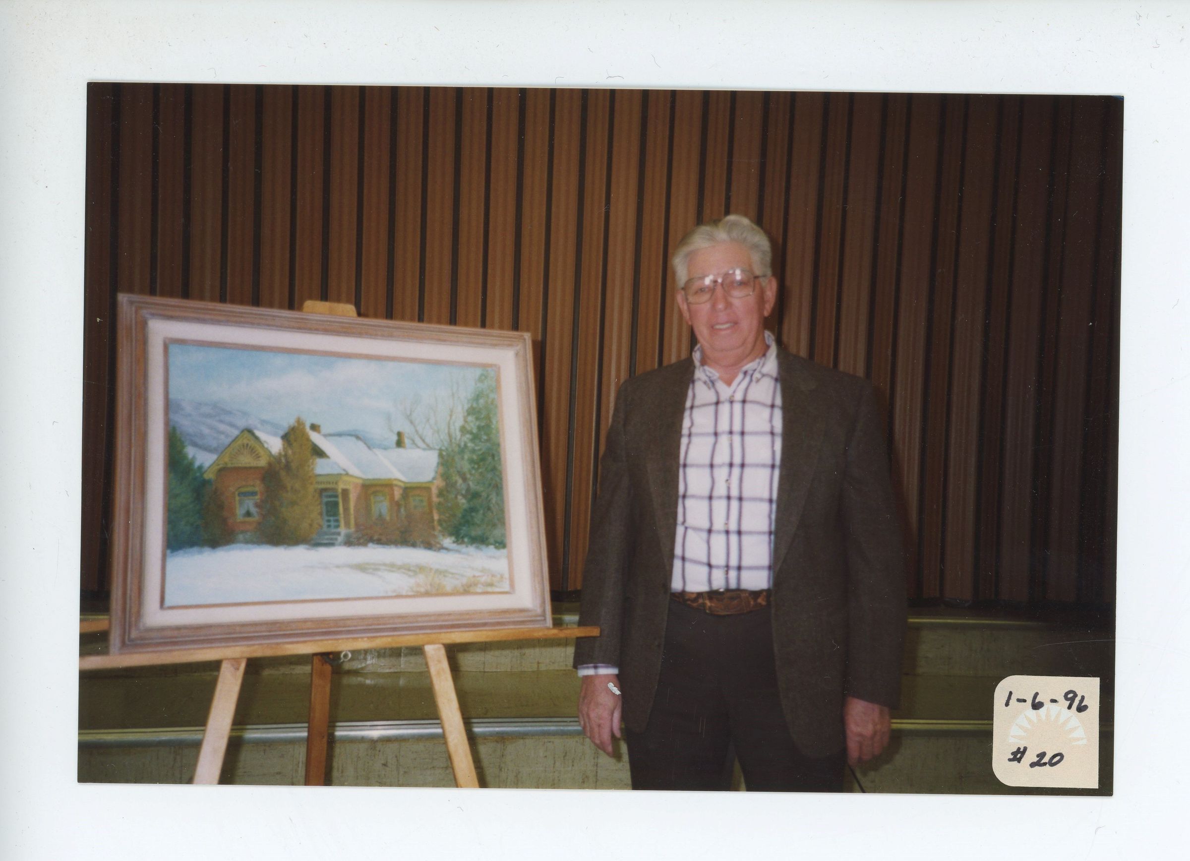 Painting on display for Kaysville Utah Centennial Celebration: "Harvey Home" on Mountain Road by Robert Day. Ben O. Brough standing next to the painting.Photograph Details
