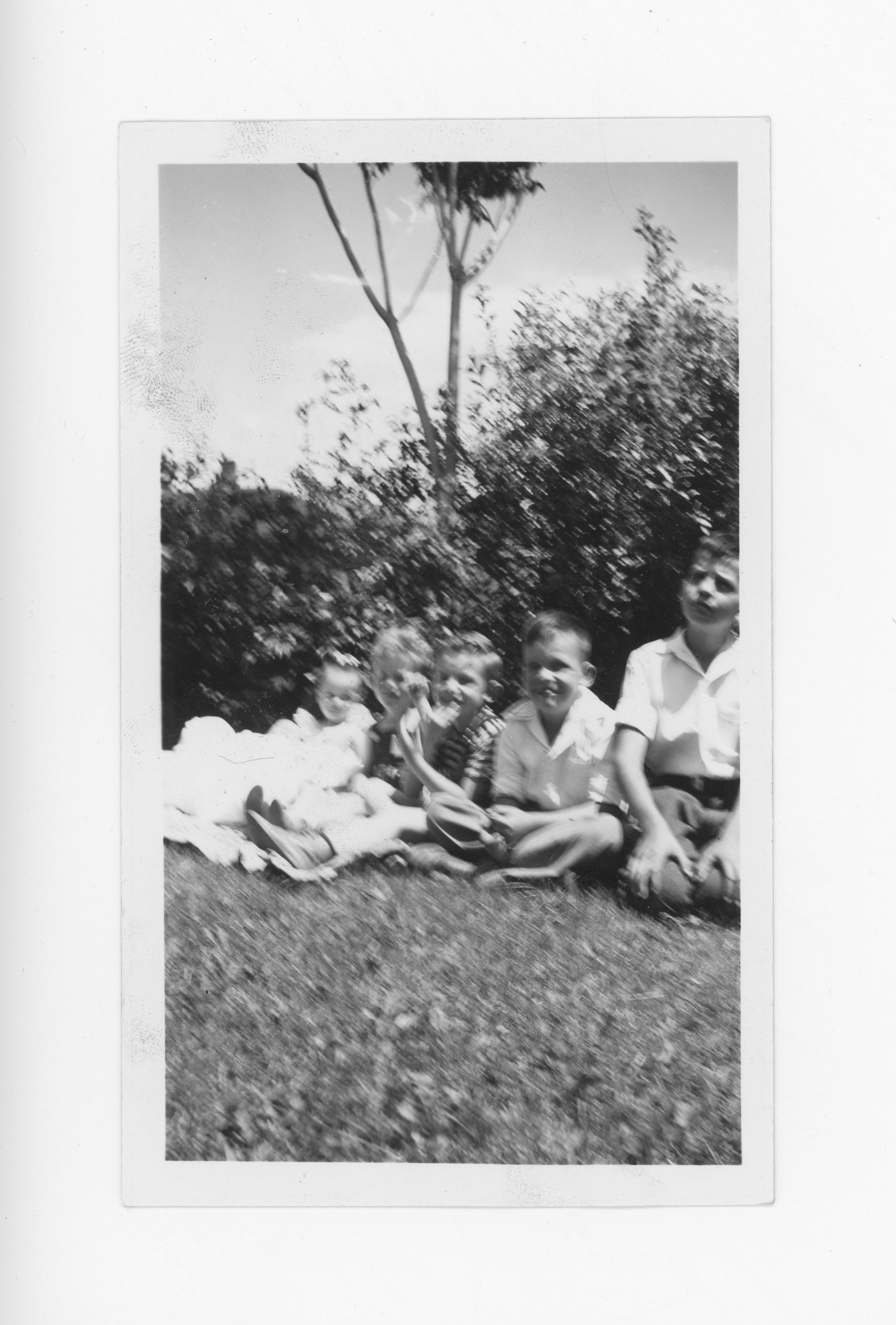 Hyde grandchildren sitting on the grass at the home of Frank and Winnifred Hyde.Photograph Details