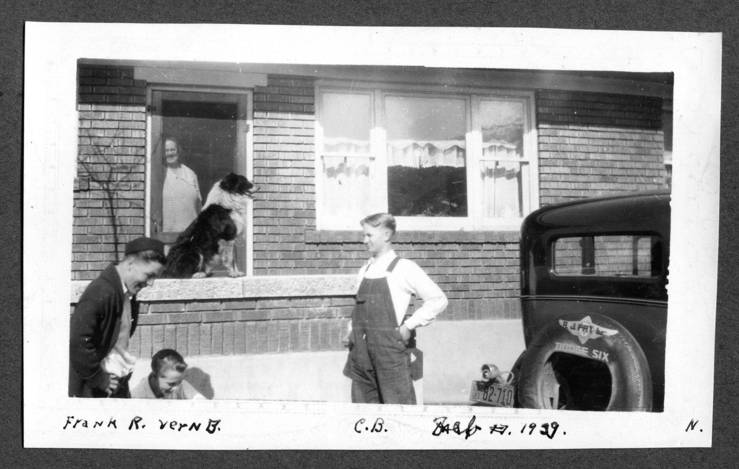 Frank Robins, Vern Butcher and Carl Butcher outside of Arthur Butcher house. Martha R. Butcher standing in doorway.Photograph Details