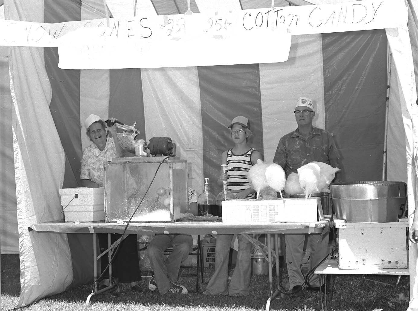 Ruth and Gally Mann with helpers in their snow cone and cotton candy booth at the Kaysville bicentennial celebration.Photograph Details