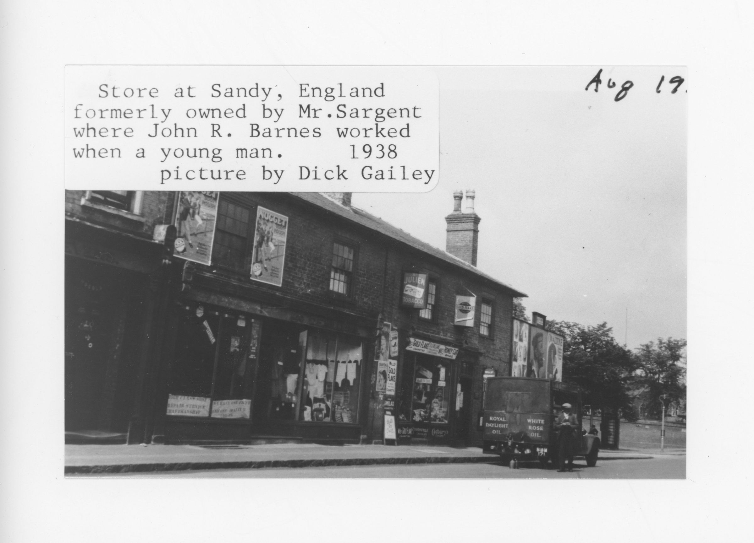 Store in Sandy, England formerly owned by a Mr. Sargent where John R. Barnes worked as a young man. Photo was taken in 1938 by Richard "Dick" Gailey when he visited sites where his ancestors lived and worked.Collection