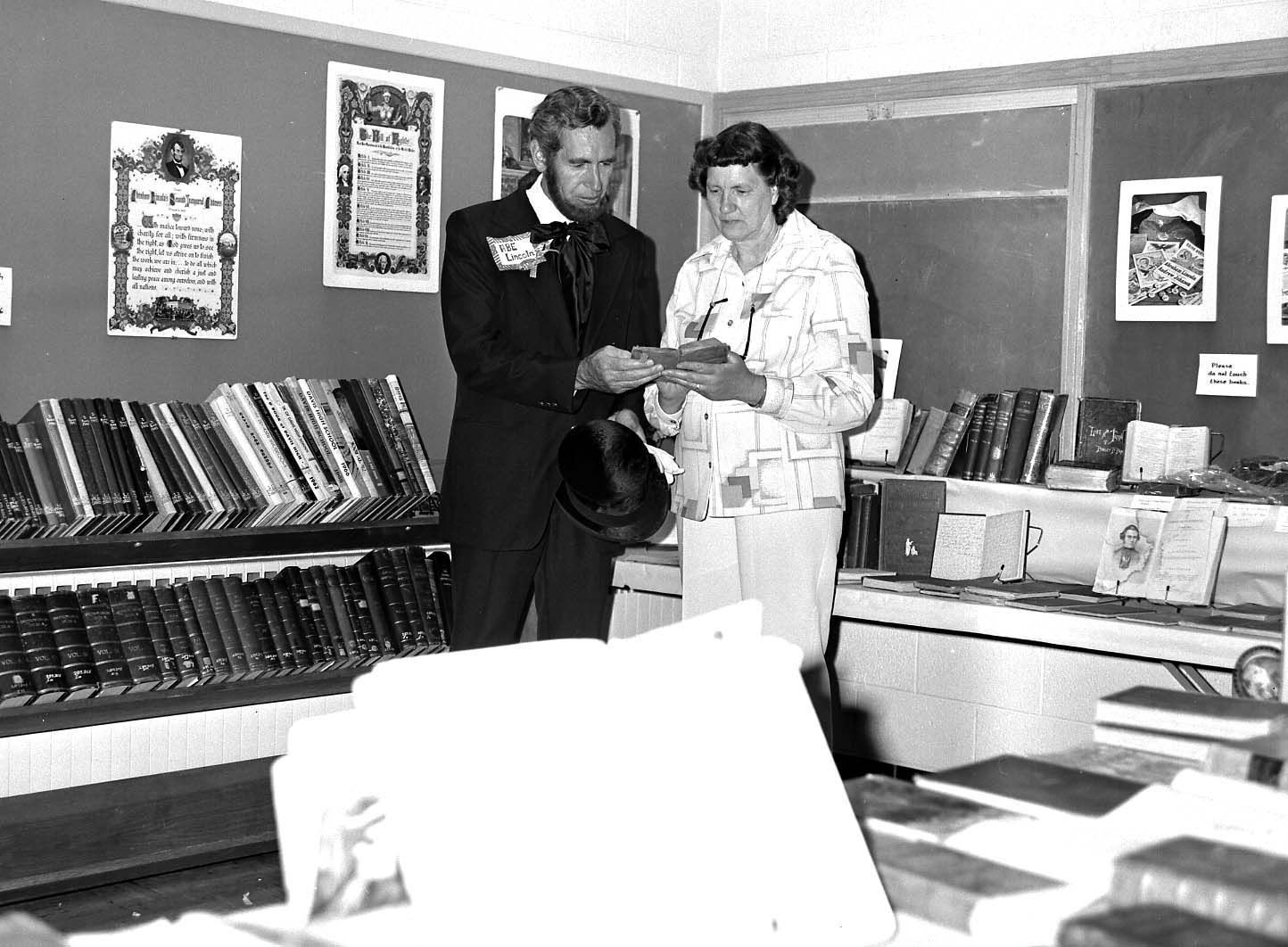 Man dressed in costume as President Abraham Lincoln standing next to Leola Prigmore.Photograph Details