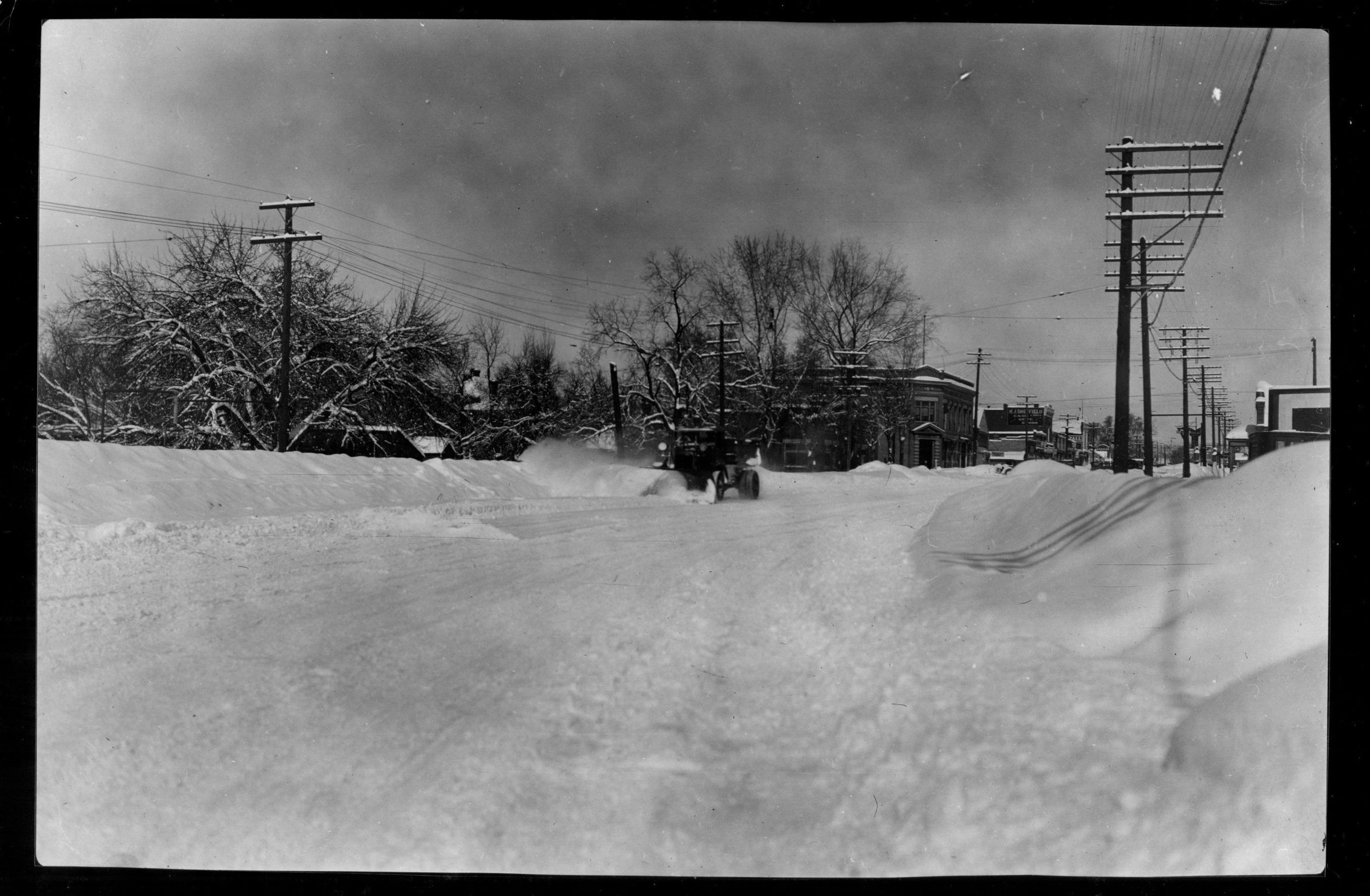 Kaysville's Main Street covered with snow and lined with telephone poles.Photograph Details