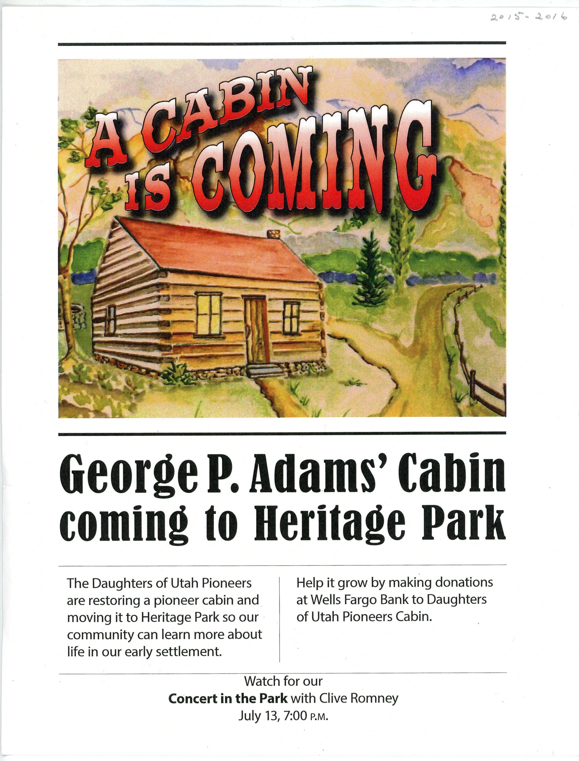 Flyer announcing upcoming relocation of George P. Adams cabin.Context