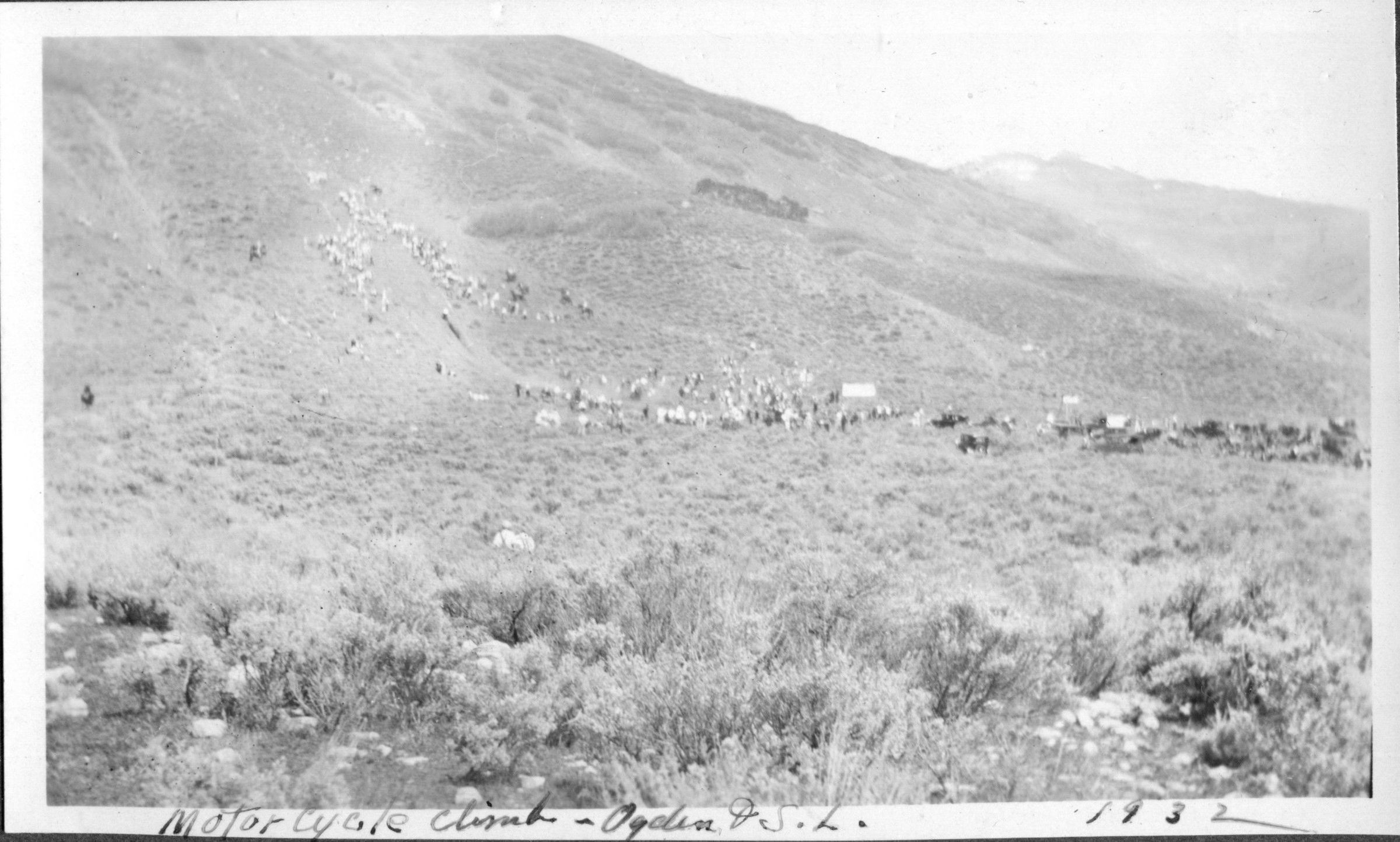 This picture was taken in 1932 at the motorcycle hill climb in Kaysville sponsored by the Ogden Motorcycle Club.Collection
