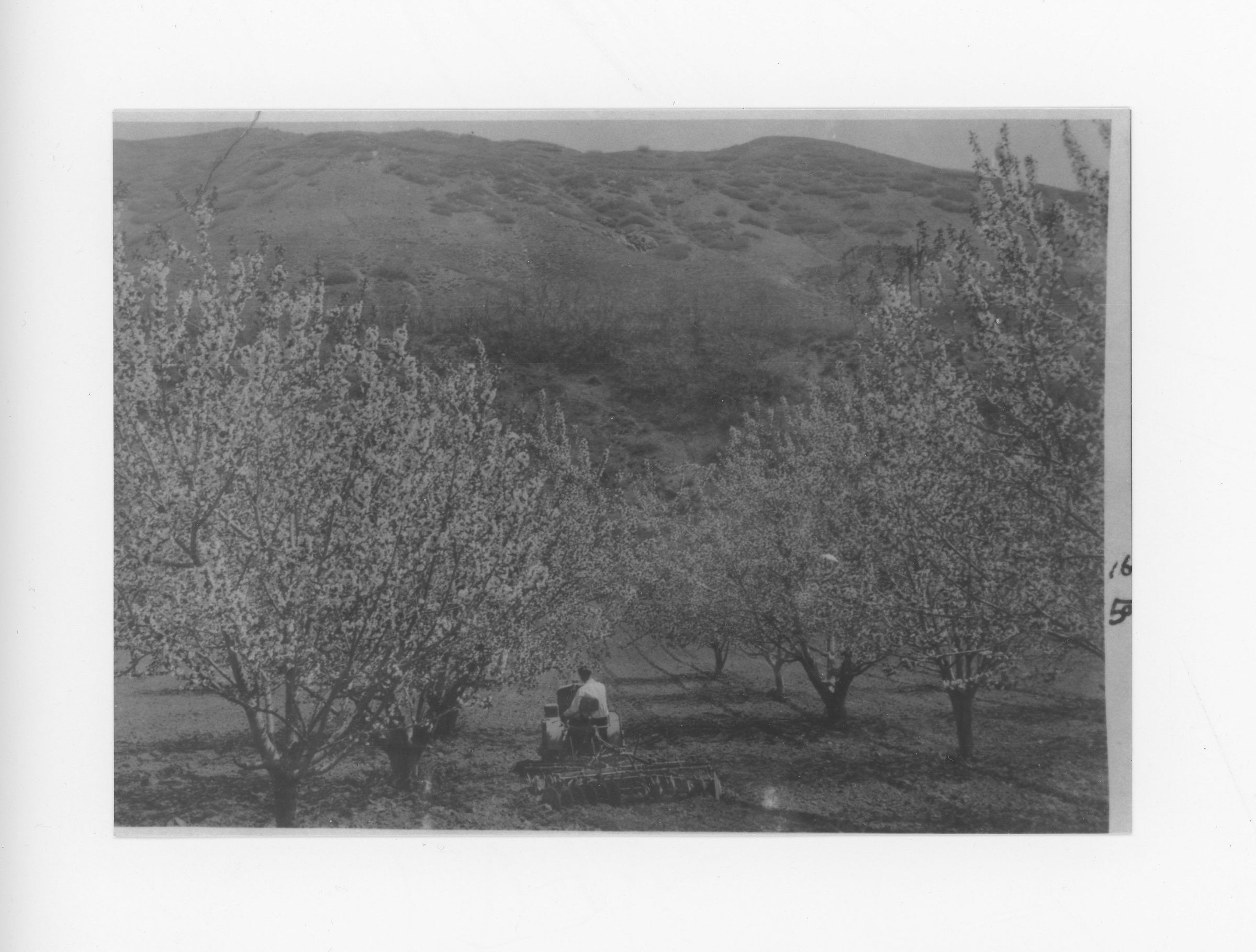 Vern Butcher cultivating his orchard in Fruit Heights, Utah. Fruit orchard was located on the old Mountain Road.