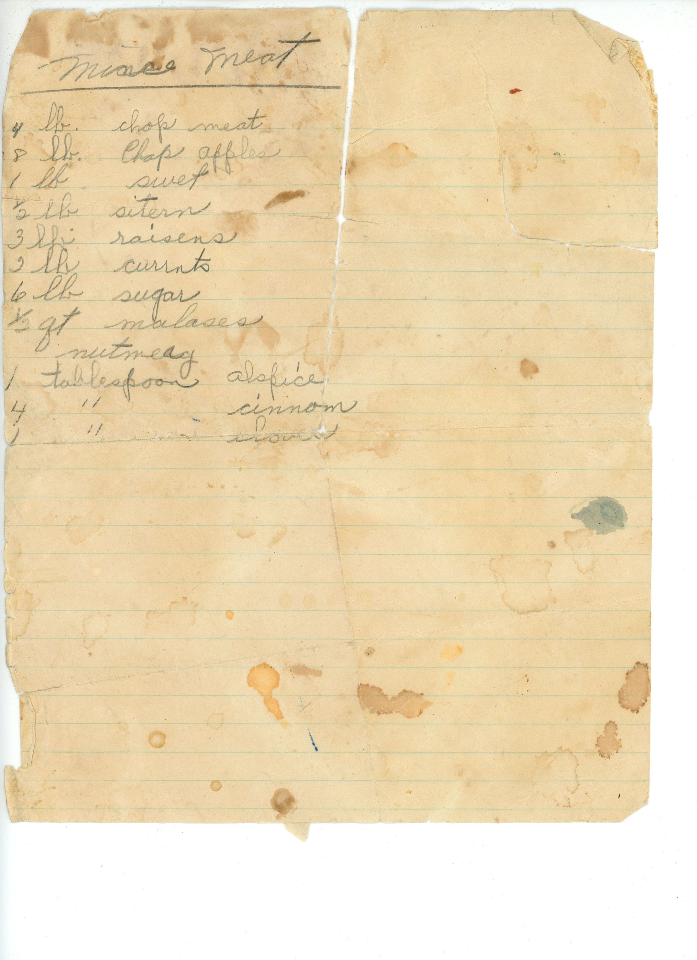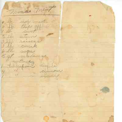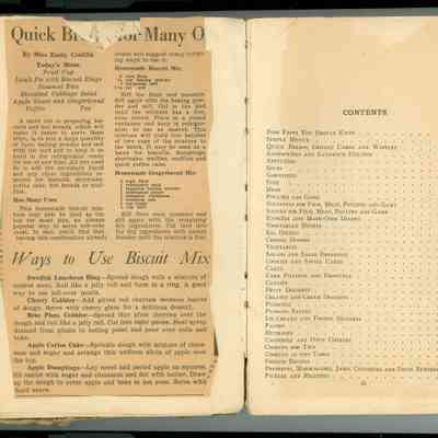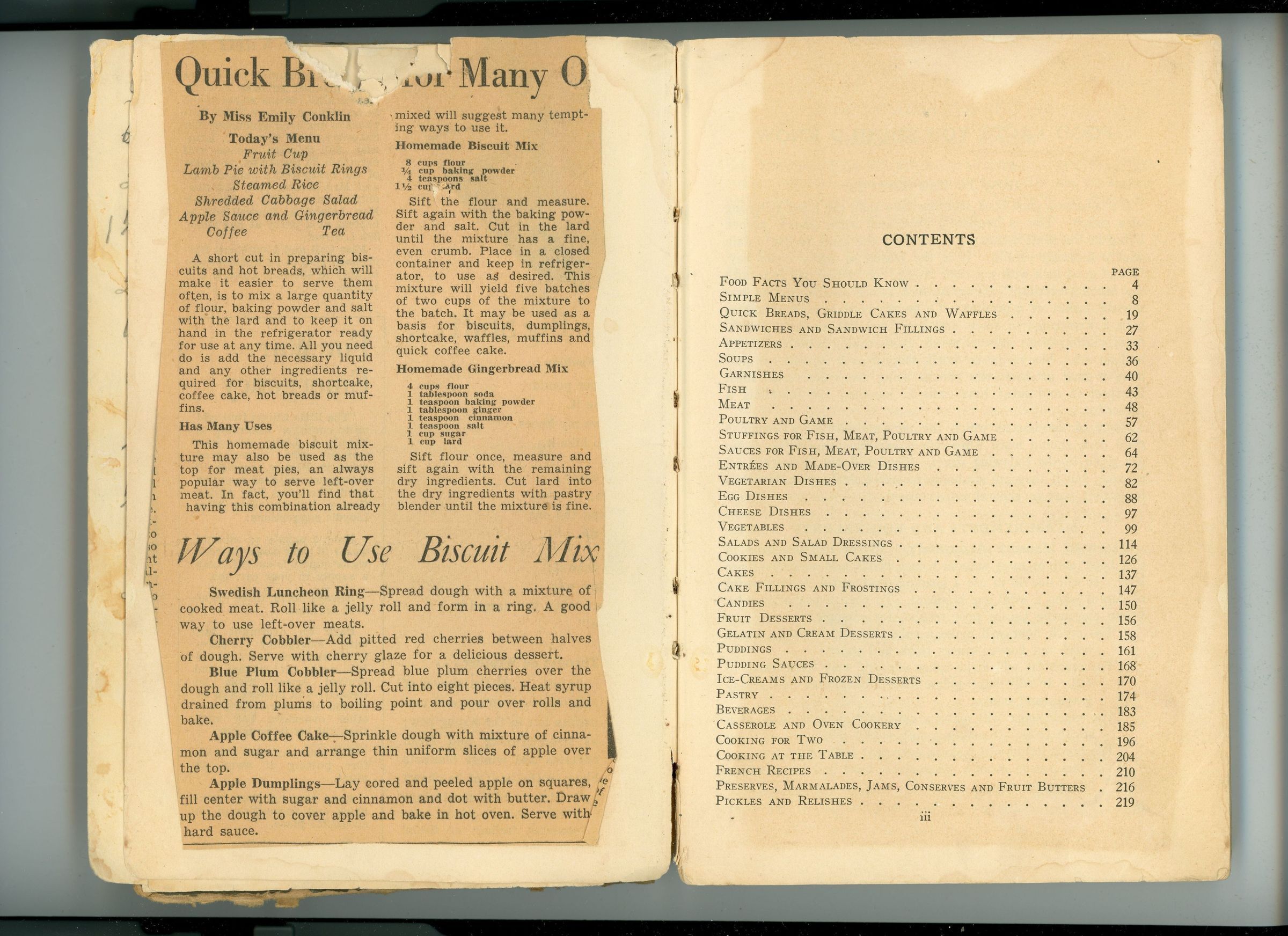 Cookbook with separated spine. Numerous loose recipes, handwritten and printed, were inserted into pages of book.Context