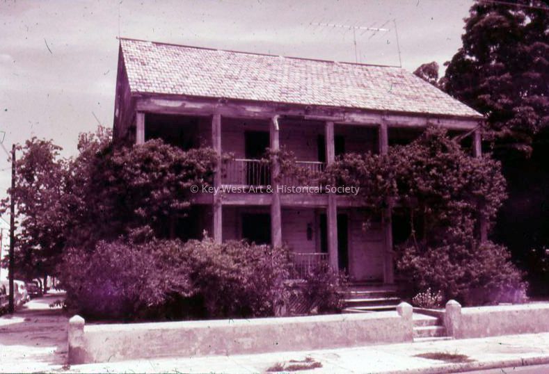 Color 35mm slide depicting the Captain John Bartlum House, also known as the Bahama House, at 730 Eaton Street. Caption on slide casing reads, 'Old Bahama House floated on raft from Islands'.