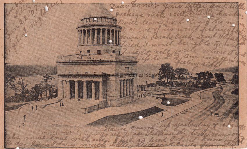 Postcard depicting a memorial. The caption reads, ‘Grant’s Tomb, New York City’. The message on the front reads, ‘Dear Carrie, your letter and little package with veil received tonight. Many thanks. I will leave for L.R. in the morning. A crowd of us went fishing tonight down to snake creek, and I feel so tired, I won’t be able to write tonight. Will write when I get up to L.R. I am sorry you were feeling sick. Naomi came up yesterday and she will go up to see Lillian W. tomorrow on the mail boat with me. I feel so tired I don’t know what to do. Mrs. Ida is much better. Will send cards from L.R. Love to all, Lillian, January 22, 1907 (my last night here).’ The message on the verso reads, ‘From L.A. Watson, Plantation Key, Planter P.6, Florida, care of J.W. Pinder.’ The card is addressed to Mrs. John W. Hattrick, 2012 Latona Street, Southwest Station, Philadelphia, Pennsylvania, and is postmarked Planter, Florida, January 23, 1907.Collection
