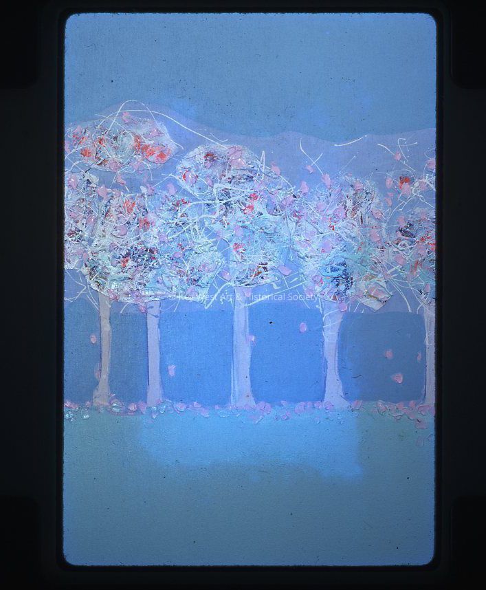 35mm color slide depicting a detailed shot of the painting 'Champs Élysées' by Ron Clemons. The work shows a line of white trees with heavy texture on a blue background.