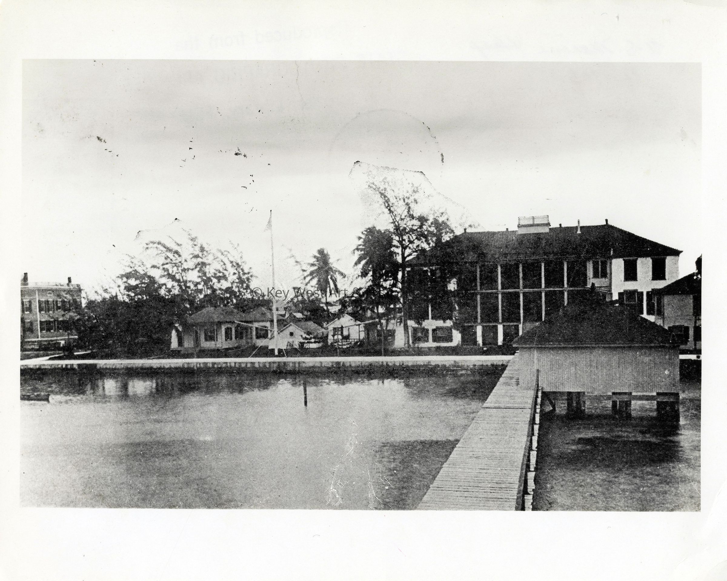 Black and white photograph of the Marine Hospital on Emma Street taken from the rear with its dock located on Naval Station Key West.