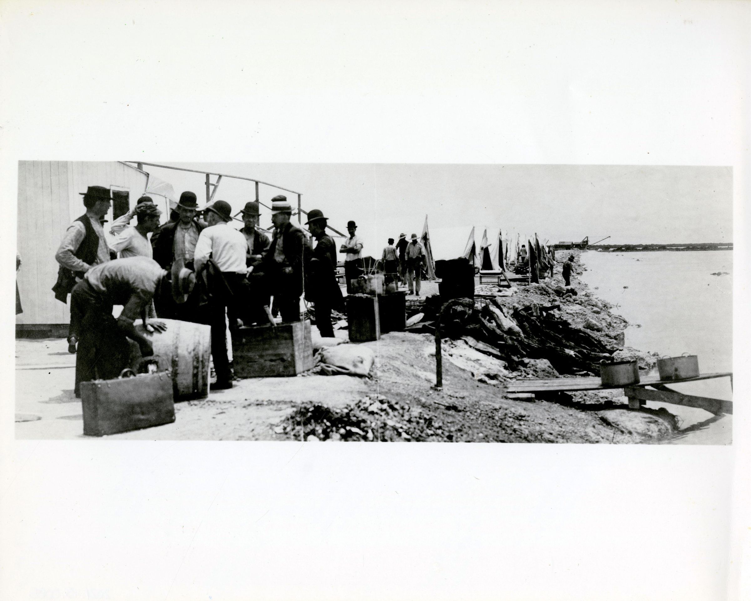 Black and white photograph of Florida East Coast Railway workers outside tents at a construction camp.