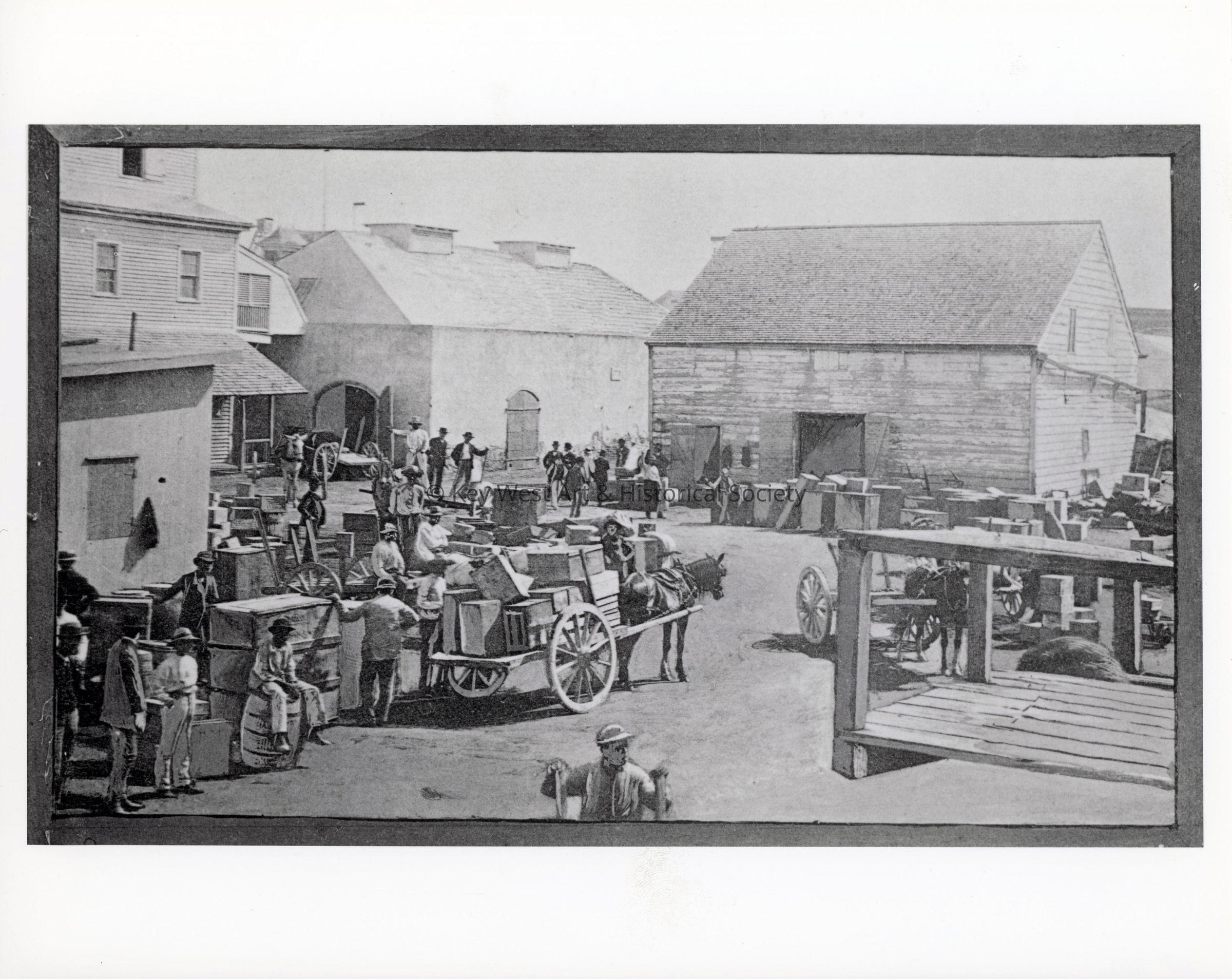 Black and white photograph of a painting depicting the area around Wall Street in Key West.
