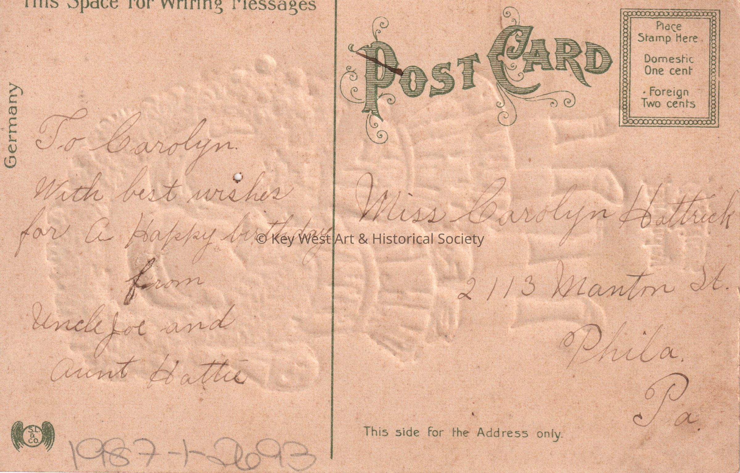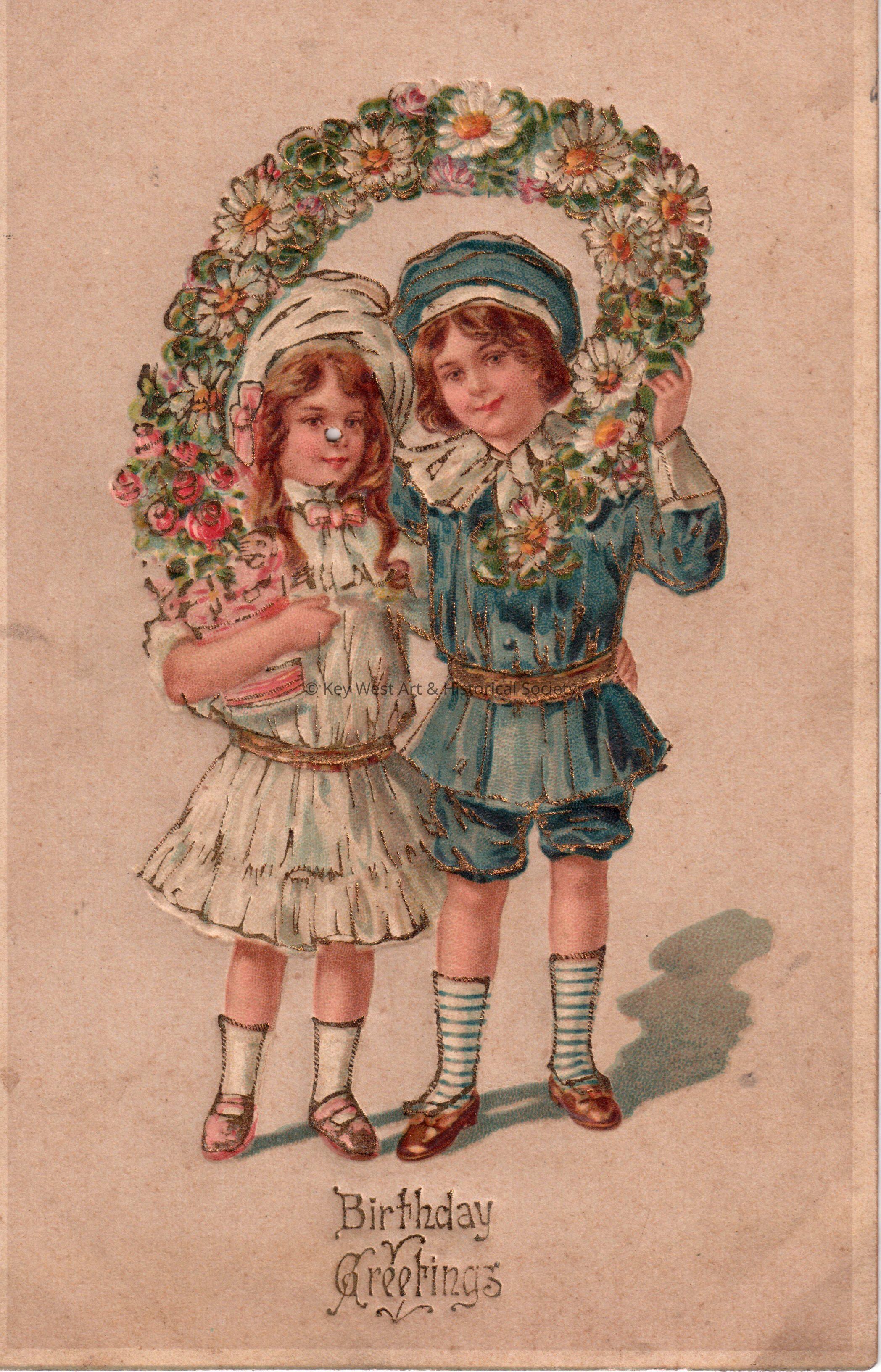 Postcard depicting a young boy and girl holding a wreath of flowers.  The caption reads, ‘Birthday Greetings’.  The message on the verso reads, ‘To Carolyn, with best wishes for a happy birthday from Uncle Joe and Aunt Hattie’.  The card is addressed to Miss Carolyn Hattrick, 2113 Manton Street, Philadelphia, Pennsylvania.Collection