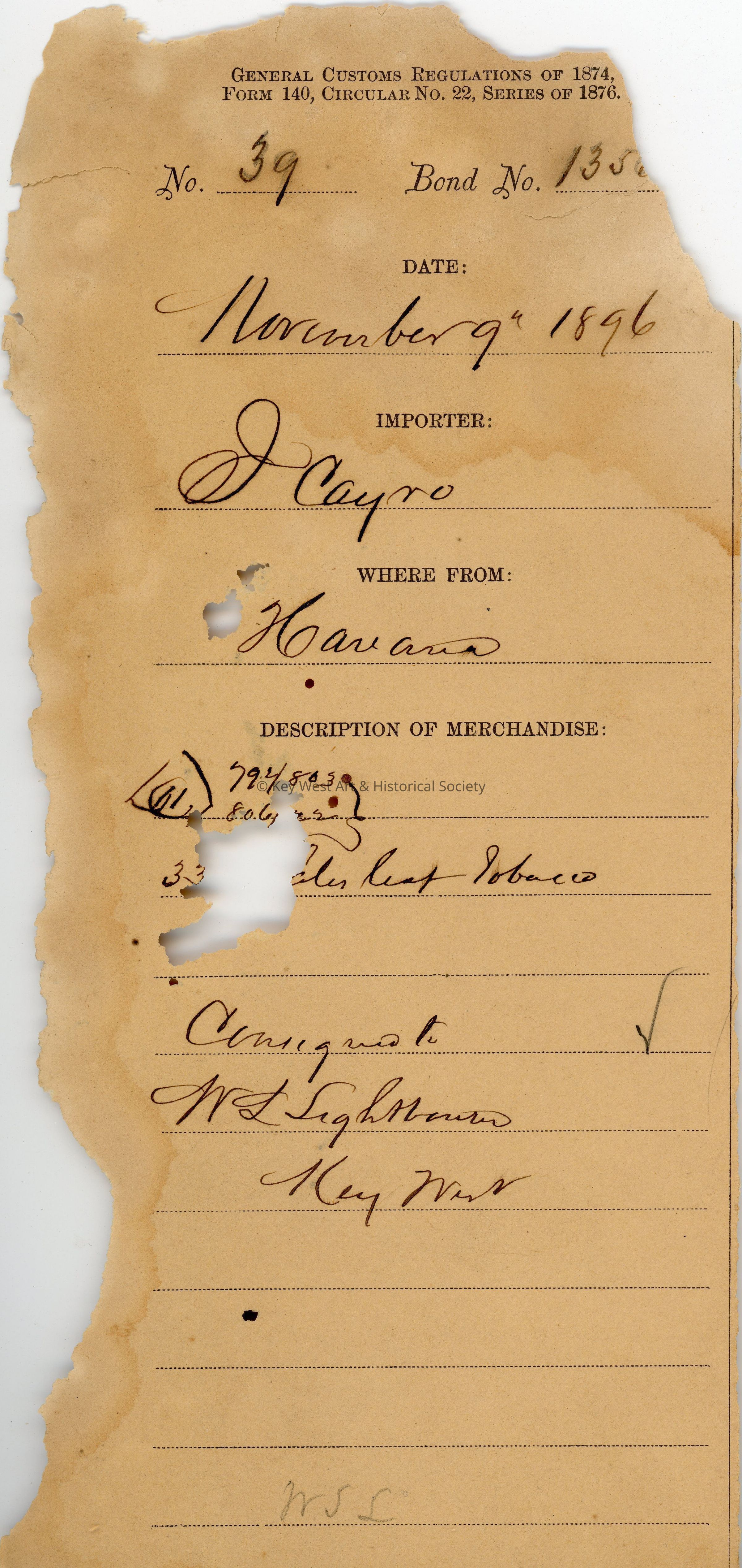Customs receipt for the importation of bales of leaf tobacco from Havana, Cuba by J. Cayro which were consigned to W.S. Lightbourn in Key West. Dated November 9, 1896.