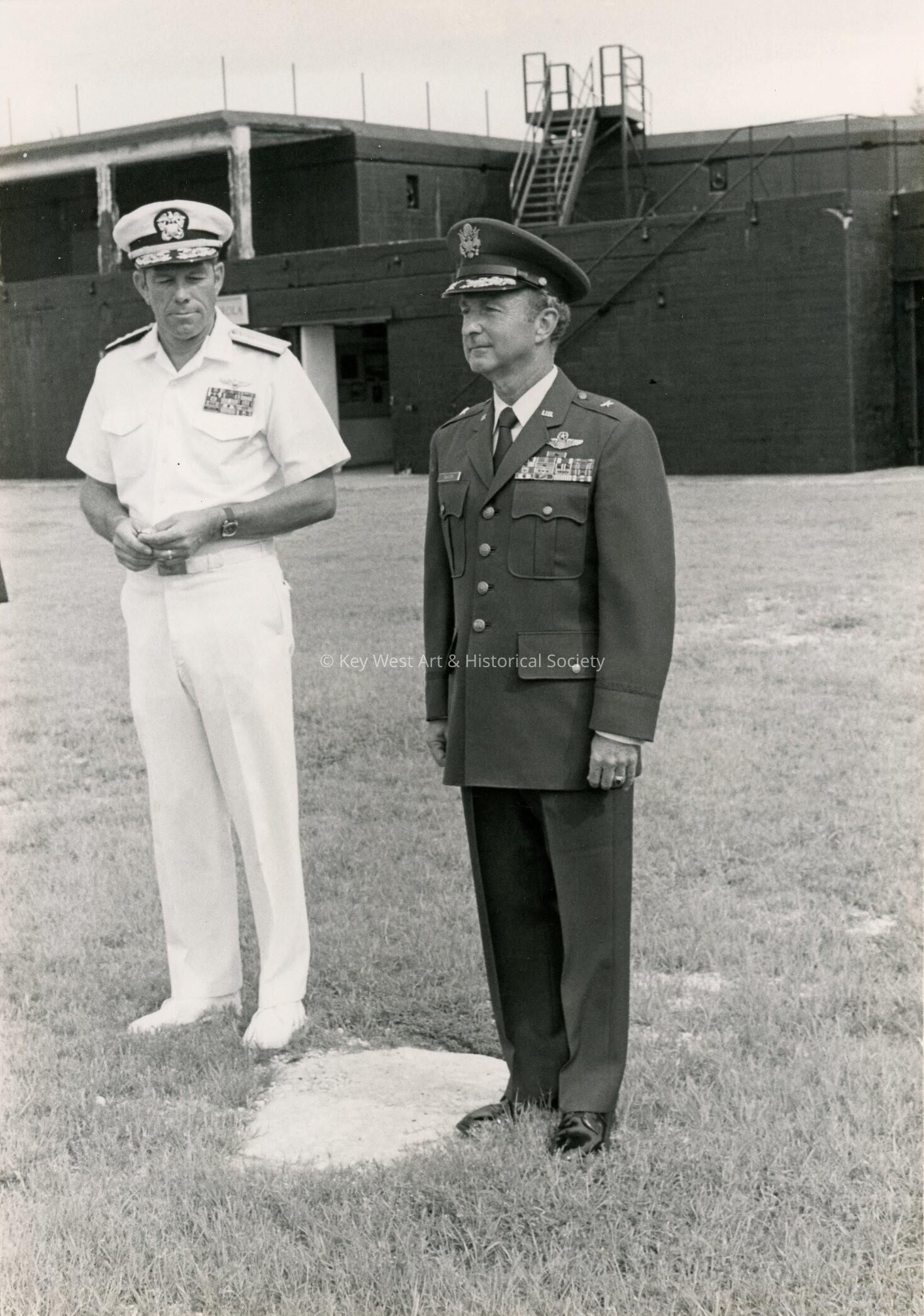 Black and white photograph of an unknown U.S. Army Brigadier General and an unknown U.S. Navy Rear Admiral at Fort Zachary Taylor.