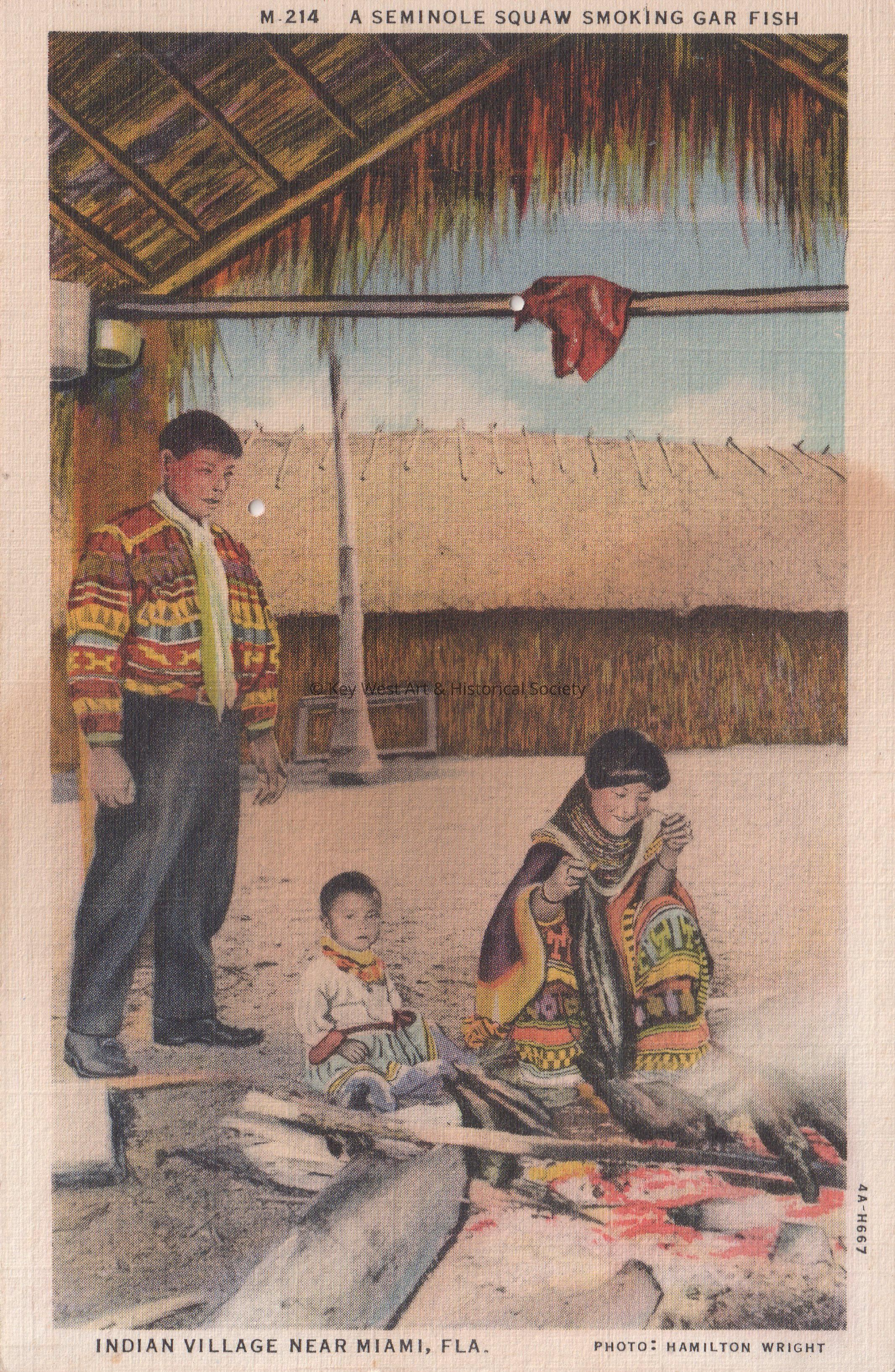 Postcard of a native American mother, father and child near a fire beneath a thatched hut. The caption reads, ‘A Seminole Squaw Smoking Gar Fish; Indian village near Miami, Florida.’Collection
