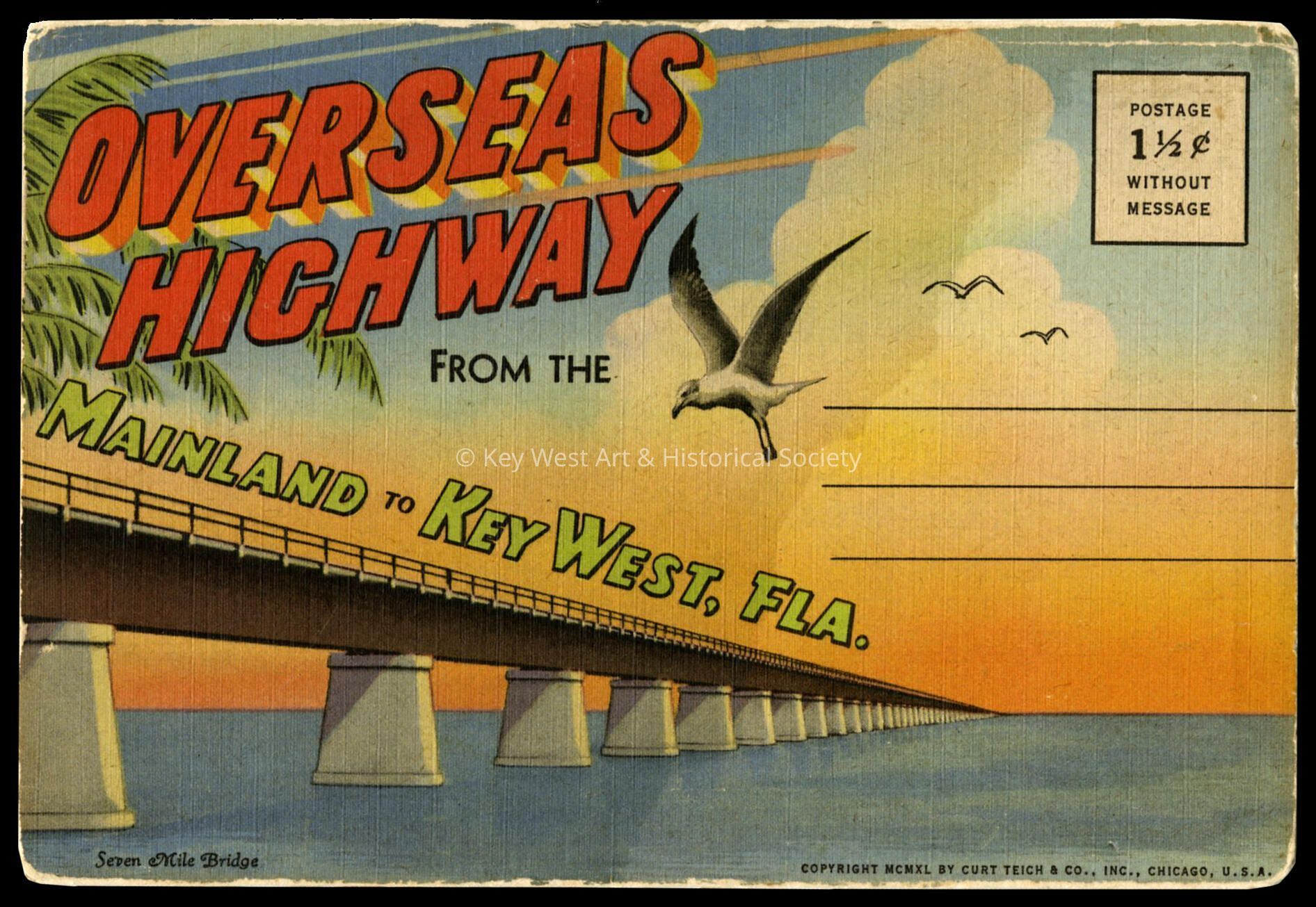 Souvenir postcard folder book containing 18 images. Night view of Overseas Highway from Bahia Honda, Moon Over Florida Keys, Bahia Honda Bridge, Key West Aquarium, Royal Poinciana Tree, Turtle Catch, Sponge Market, Southernmost House, Old Fort Jefferson, Long Key Viaduct, Channel No. 2 and Channel No. 5 Bridge, Seven Mile Bridge, Overseas Highway from Pigeon Key, Tarpon Fishing, Overseas Highway spanning Pigeon Key, Bahia Honda Bridge and Overseas Highway Bridge at Pigeon Key at Night.Subject Place