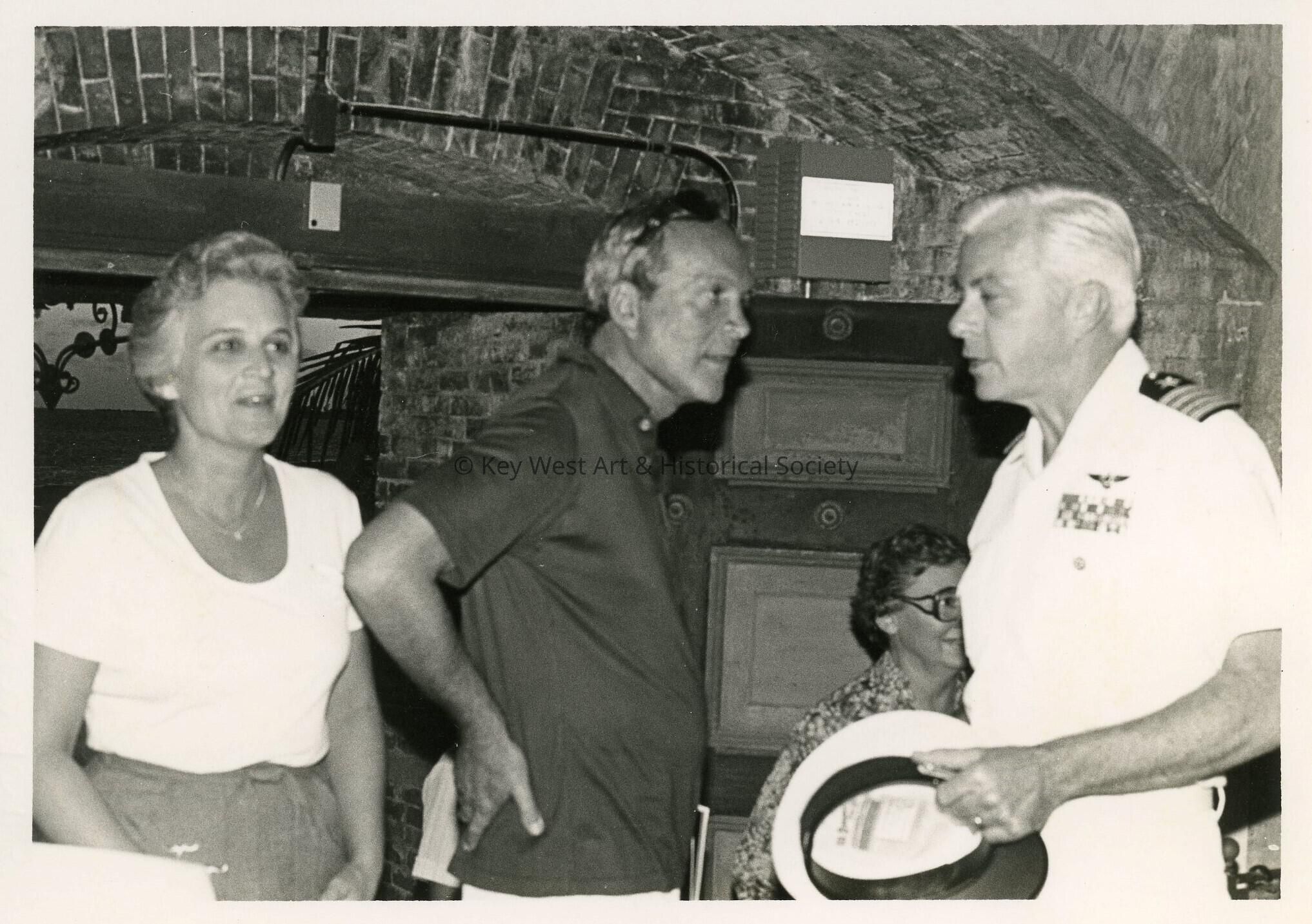 Black and white photograph of David Wolkowsky (center) standing at the entrance to Fort East Martello Museum.