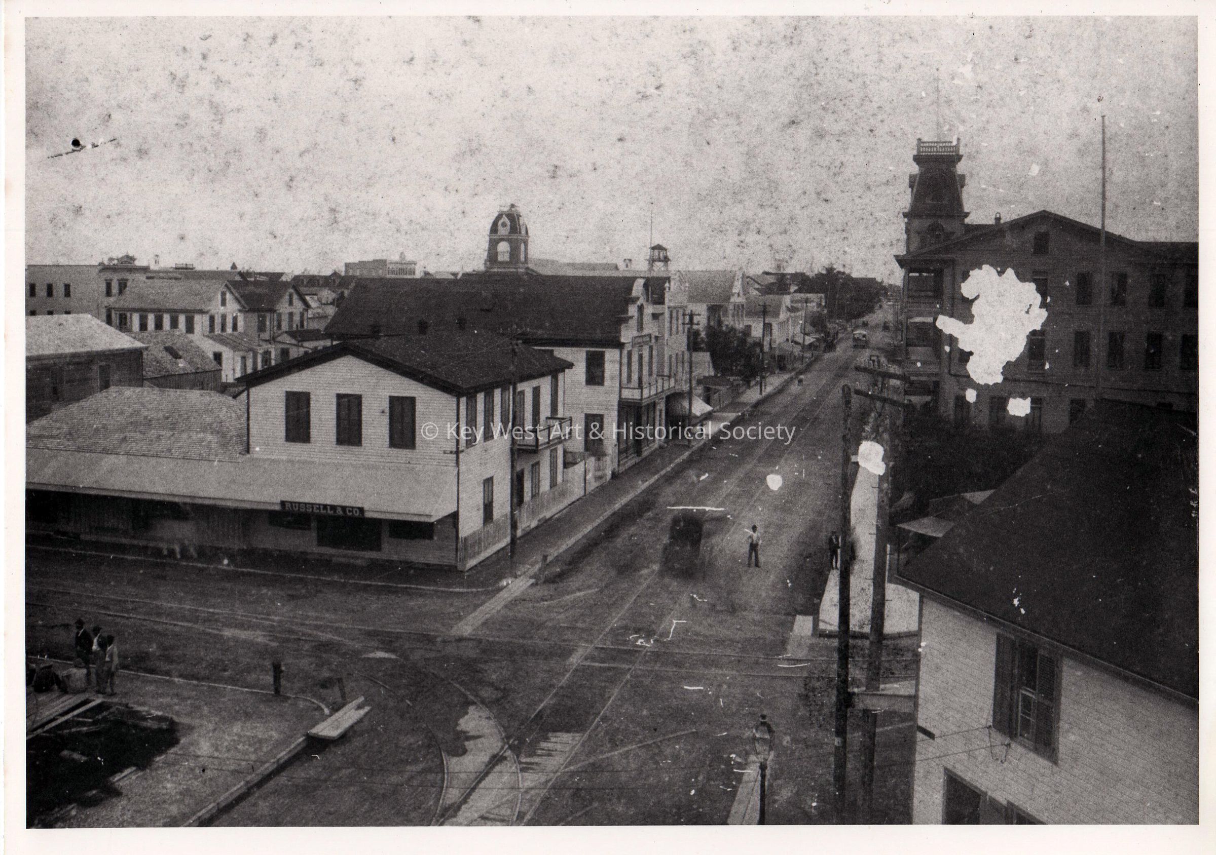 Black and white photograph of the 100 block of Duval Street looking south. The Jefferson Hotel is visible on the right and Old City Hall left of center.