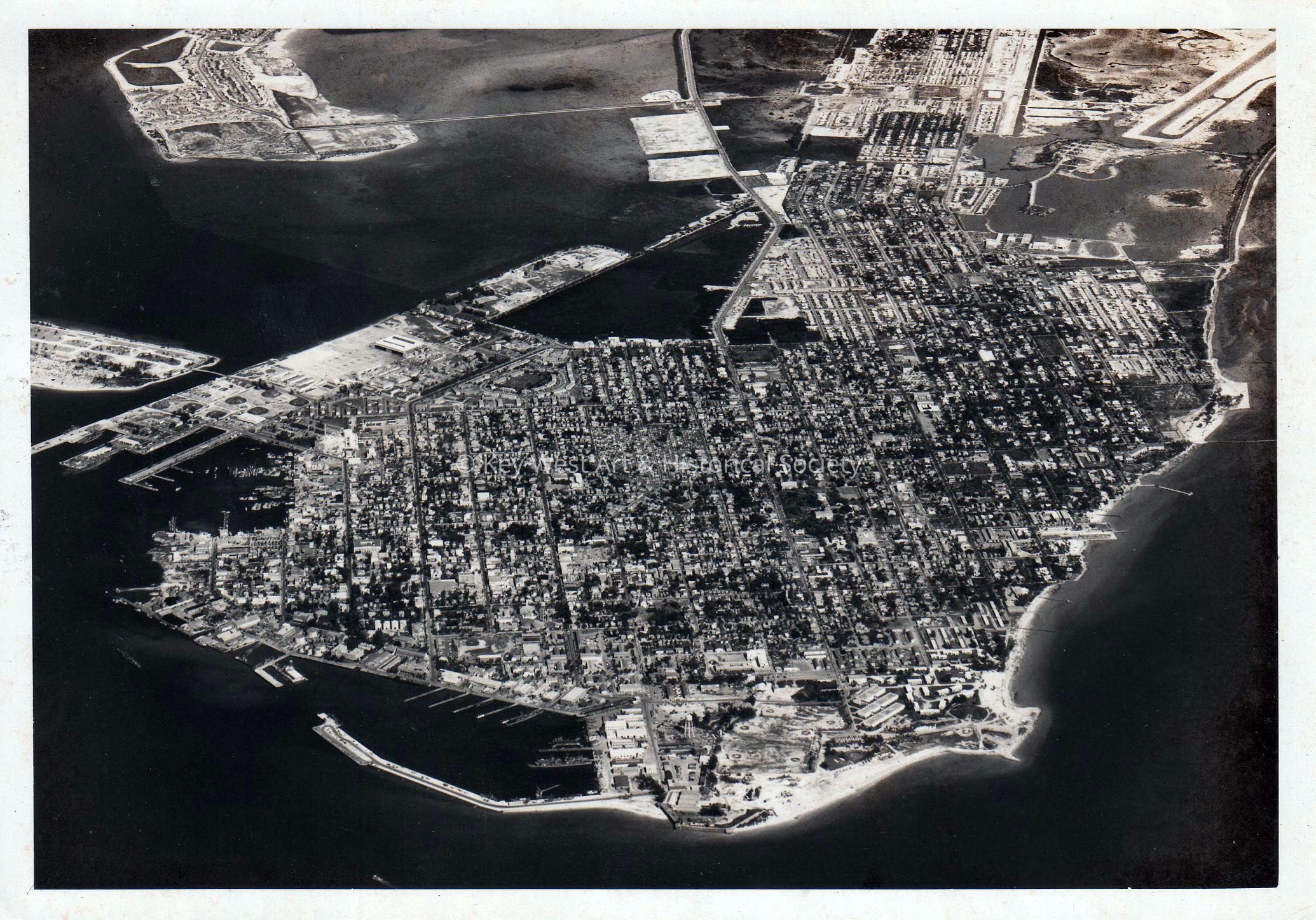 Black and white aerial photograph of Key West including Naval Station Key West.