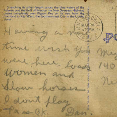 Postcard depicting the Seven Mile Bridge over Pigeon Key at night. The caption reads, ‘Seven Miles Oversea Highway Bridge from Pigeon Key, at night, on way to Key West, Florida.’ The description on the verso reads, ‘Stretching its silver-length across the blue waters of the Atlantic and the Gulf of Mexico, the new Overseas Highway passes completely over Pigeon Key on its way from the mainland to Key West, the Southernmost City in the United States.’Subject Place