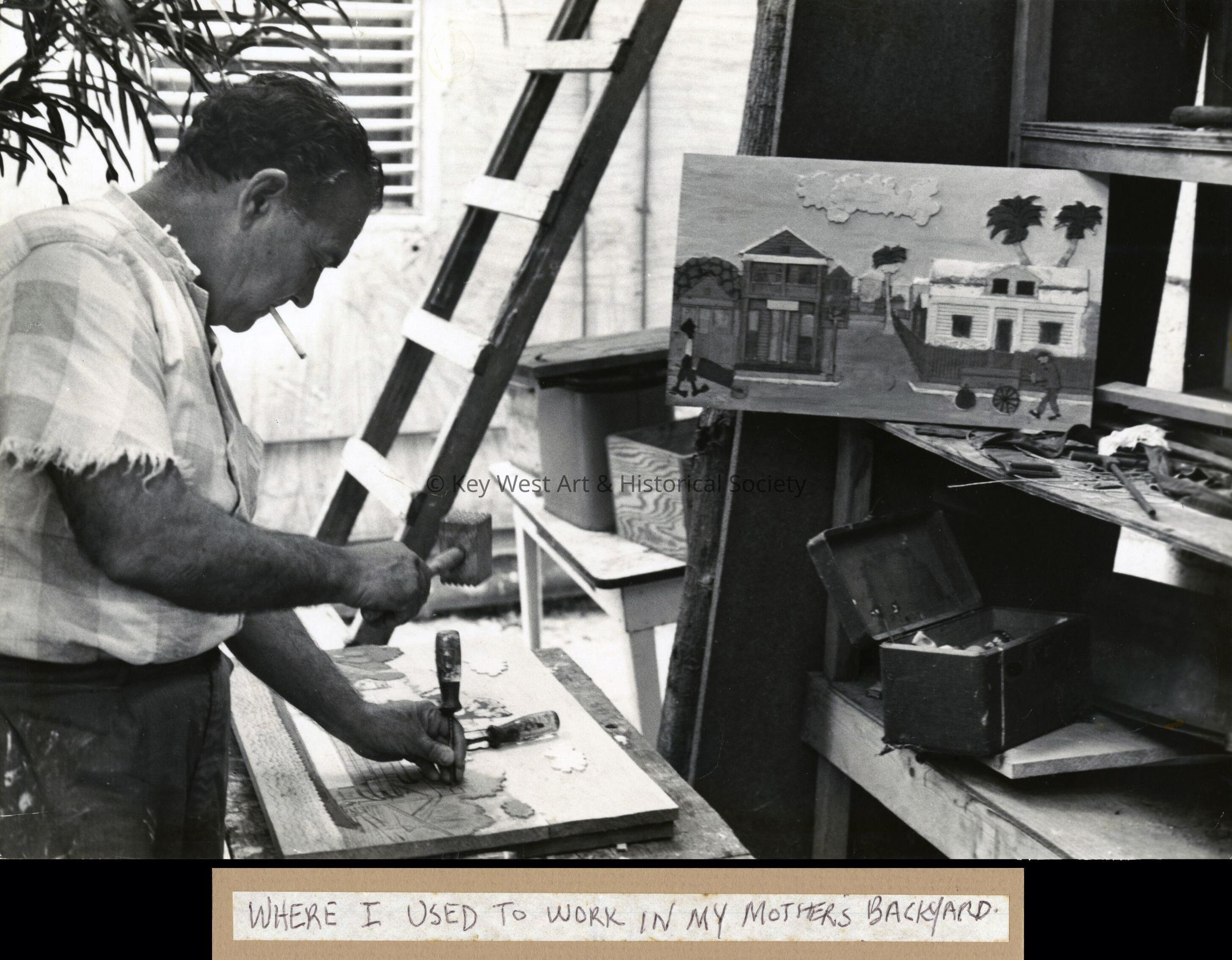 Black and white photograph of Mario Sanchez at work in the Studio Under the Trees in the 1970s. Caption included with photograph, in Sanchez's handwriting, 'Where I used to work in my mother's backyard.'