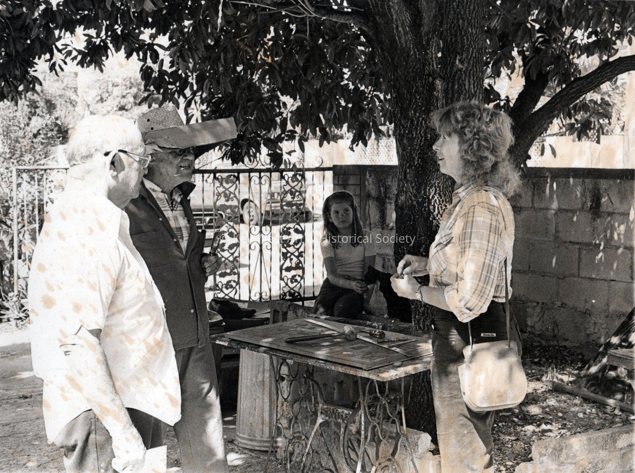 Black and white photograph of Mario Sanchez wearing a cardboard hat in his Studio Under the Trees speaking with visitors.