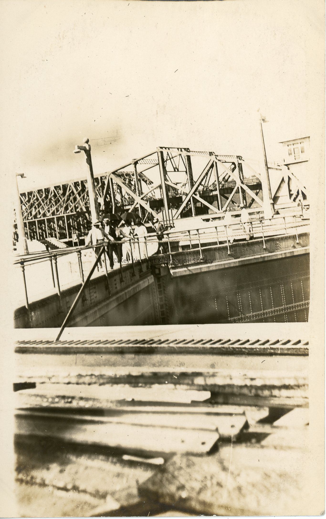 Black and white photograph postcard depicting the early days of the Panama Canal. The photo shows a small group of people, some holding umbrellas, crossing a walkway. The postcard is addressed to Mrs. Geo. A. Balling.Subject
