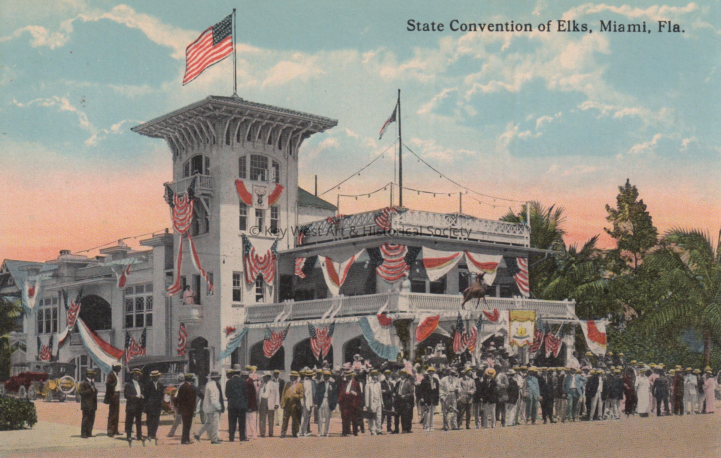 Postcard of a group of men in front of a building decorated with flags and bunting. The caption reads, ‘State Convention of Elks, Miami, Florida.’Collection