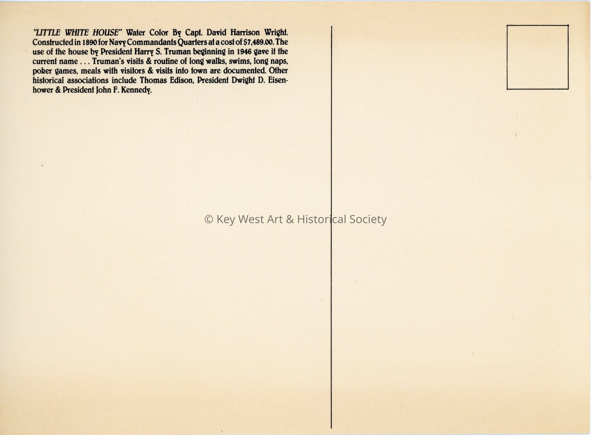 Postcard with a watercolor illustration of the Little White House Quarters 'A' circa 1900-1918. The building was originally constructed as Navy Commandants Quarters in 1890. The original painting was completed by David Harrison Wright in 1986.  Notation on verso, 'Little White House' Water Color by Capt. David Harrison Wright.  Constructed in 1890 for Navy Commandants Quarters at a cost of $7,489.00.  The use of the house by President Harry S Truman beginning in 1946 gave it the current name...Truman's visits & routine of long walks, swims, long naps, poker games, meals with visitors & visits into town are documented.  Other historical associations include Thomas Edison, President Dwight D. Eisenhower & President John F. Kennedy.'Subject Person/Organization