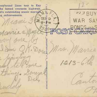 Postcard depicting the Seven Mile Bridge between Miami-Key West. The bus that goes to sea. The Florida Greyhound Limes tour to Key West travels the famed Overseas Highway, one of the world's outstanding scenic marvels and engineering achievements.Collection
