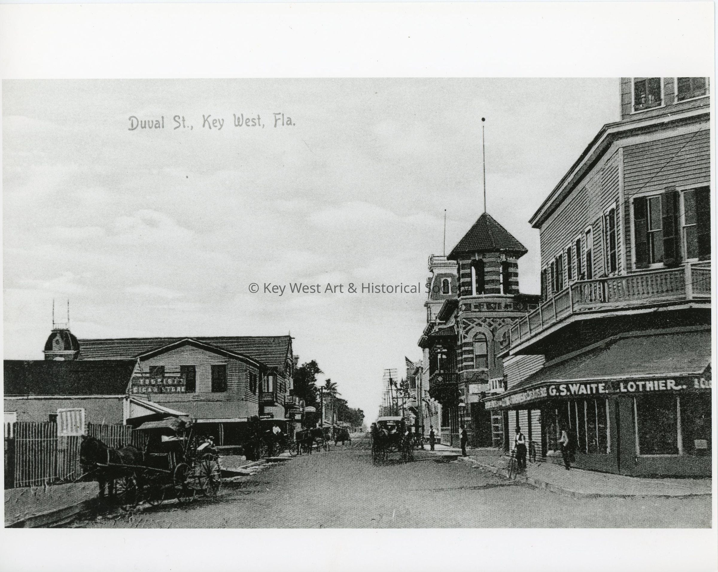 Black and white photograph of the 100 block of Duval Street, looking south.