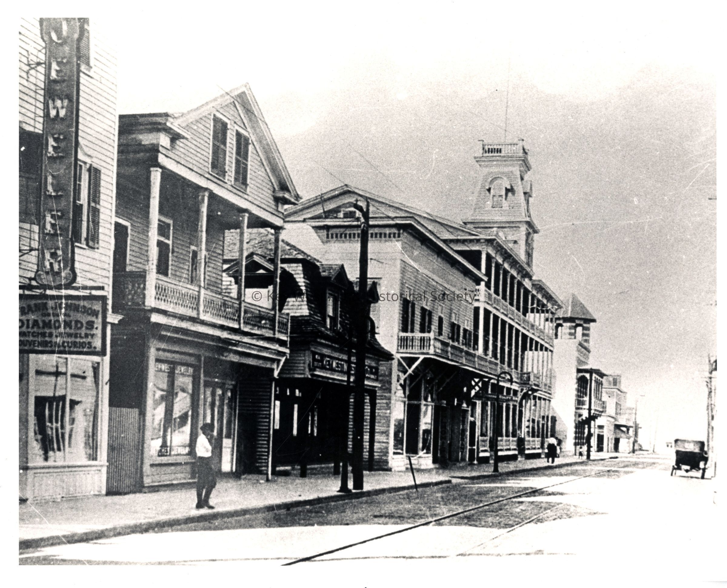 Black and white photograph of the 100 block of Duval Street. Businesses visible are Frank Johnson Jeweler, the Jefferson Hotel and the First National Bank.