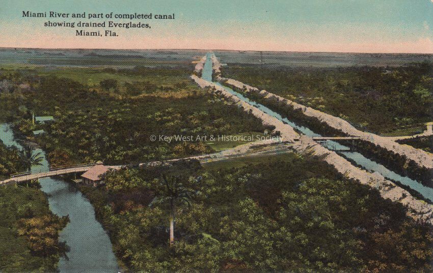 Postcard depicting an aerial view of the Miami River and a canal. The caption reads, ‘Miami River and part of completed canal showing drained Everglades, Miami, Florida.’Collection