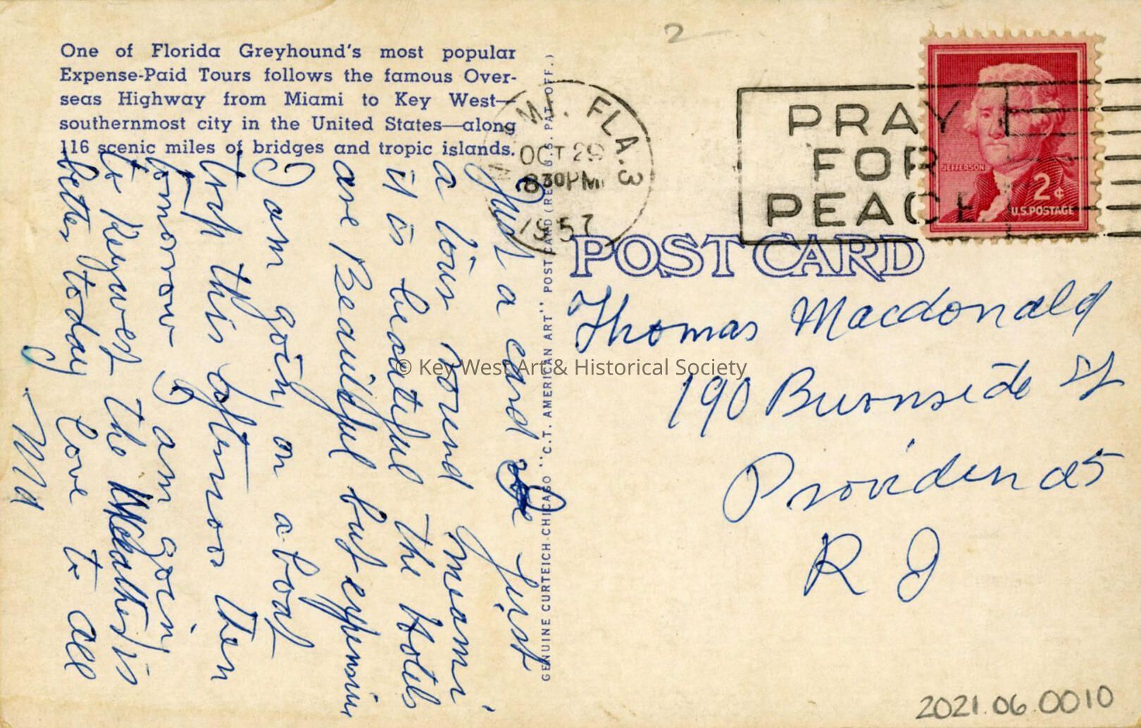 Postcard depicting a bus on a bridge near two women fishing. The caption reads, ‘“The bus that goes to sea". The Seven Mile Bridge Between Miami and Key West.' The description on the verso reads, 'One of Florida Greyhound's most popular Expense-Paid Tours follows the famous Overseas Highway from Miami to Key West - southernmost city in the United States - along 116 scenic miles of bridges and tropic islands.'Subject Place