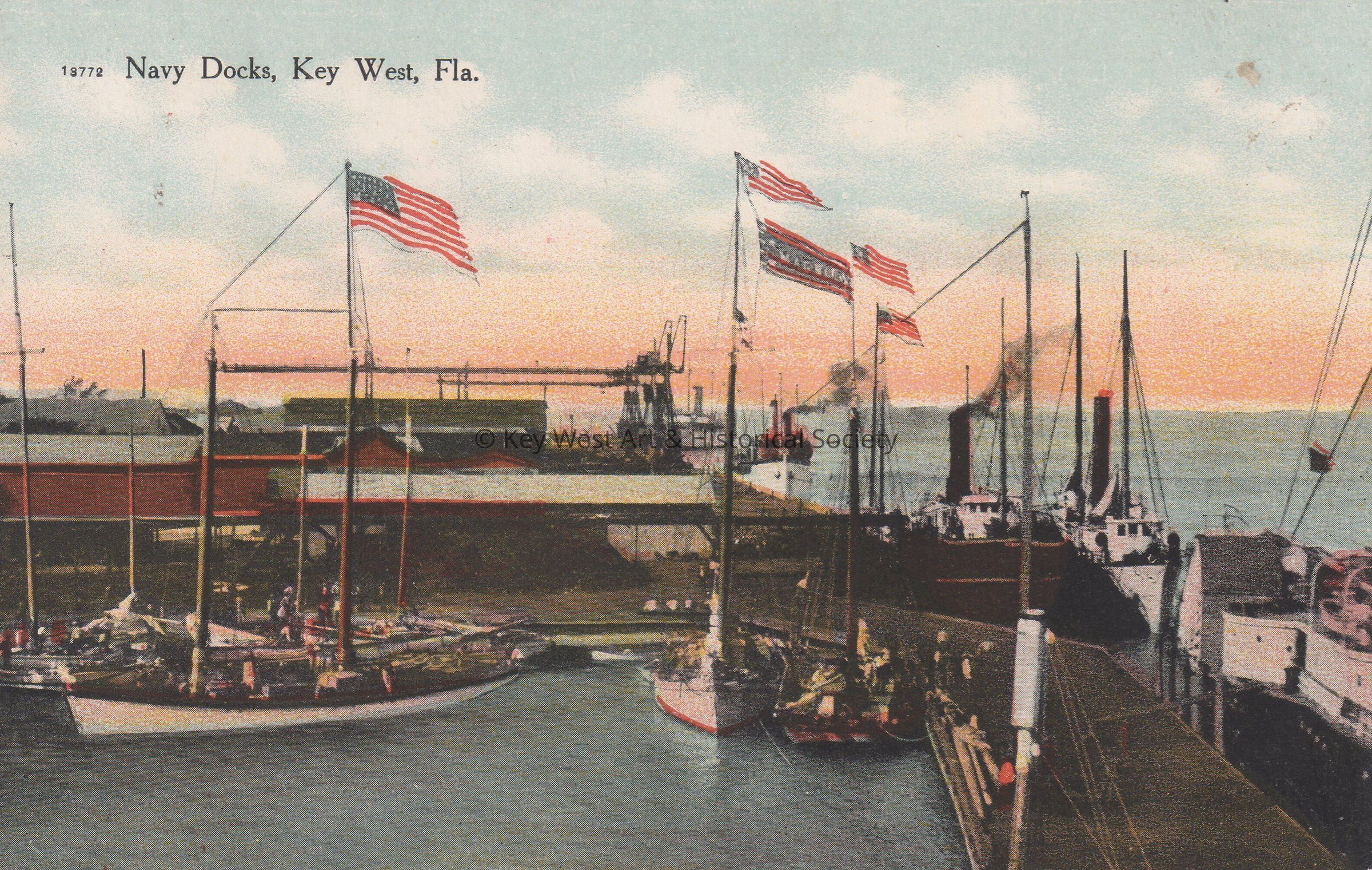 Postcard depicting docked steamboats and sailboats flying American flags.  The caption reads, ‘Navy Docks, Key West, Florida.’Subject Person/Organization
