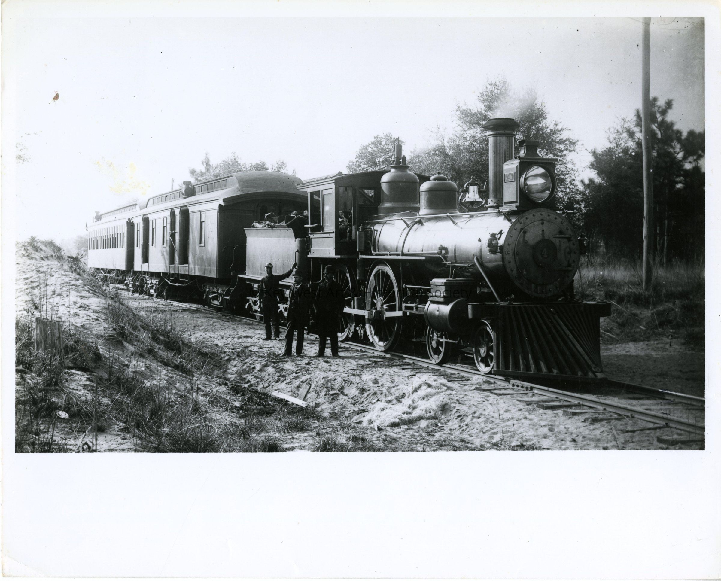 Black and white photograph of crew and a locomotive belonging to the Florida East Coast Railway.