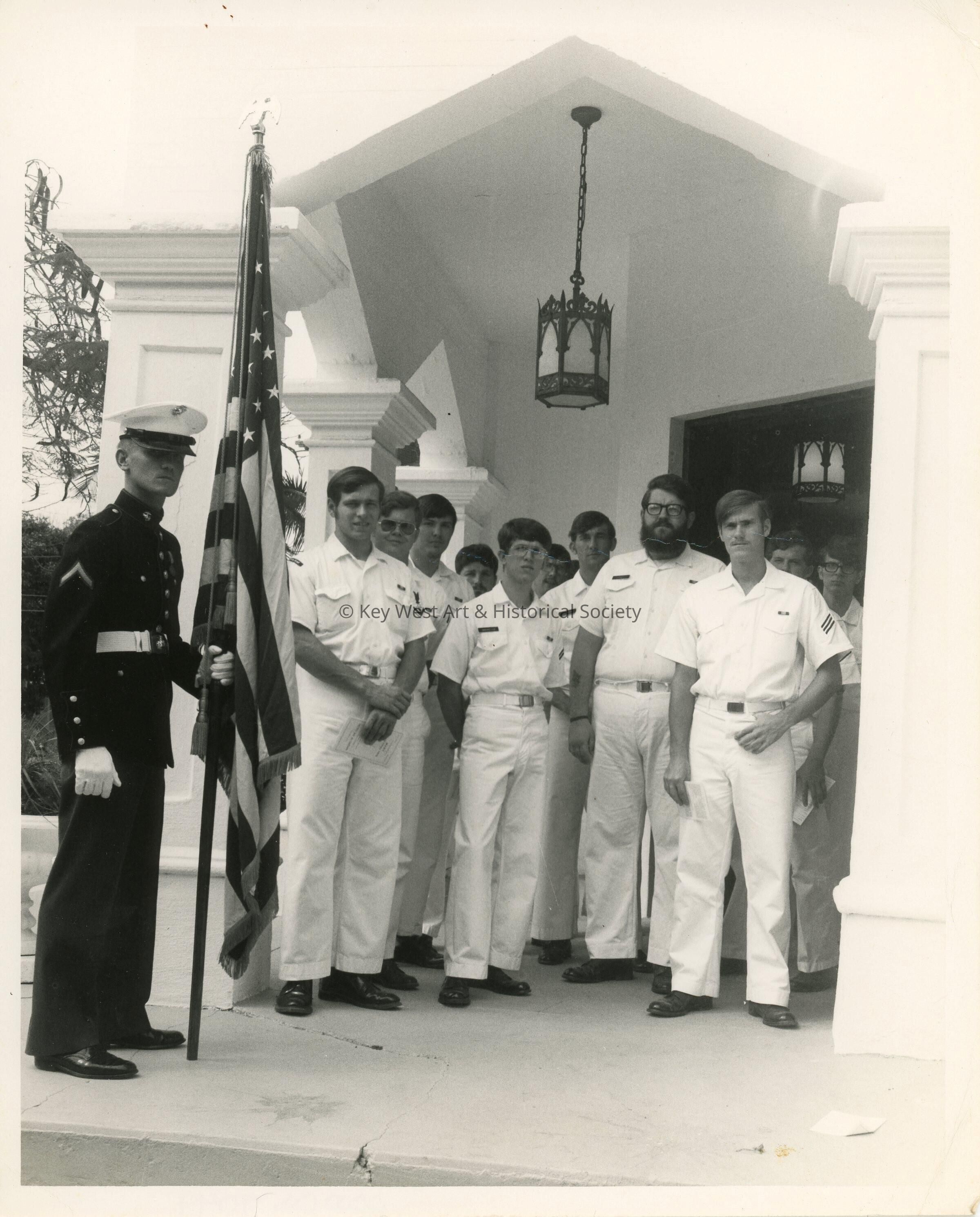 A group of unknown men in uniform standing outside of a buildingEntry/Object ID