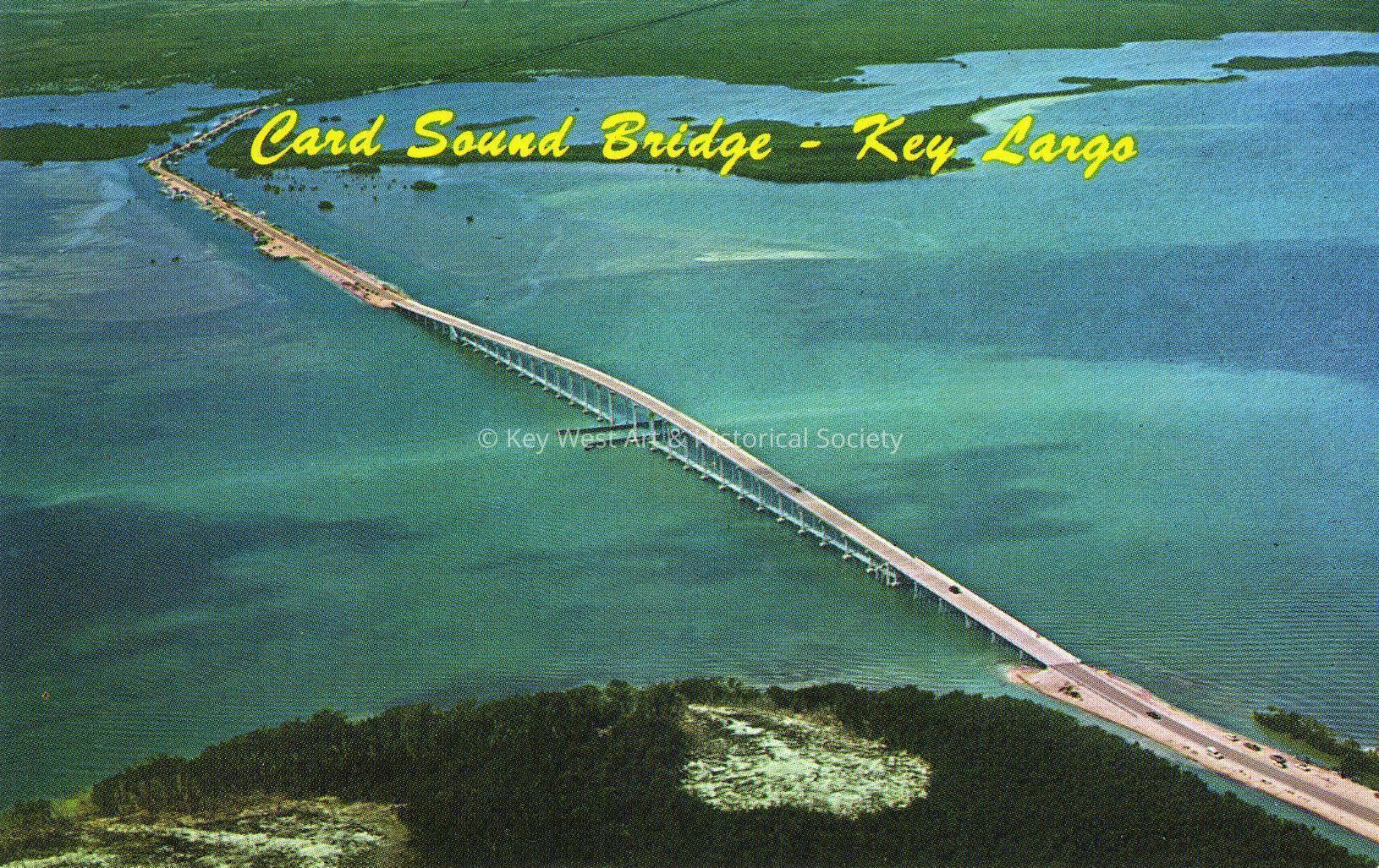 Postcard depicting an aerial view of Card Sound Road Bridge in Key Largo. Notation on verso, 'Aerial view of the Card Sound Bridge, Key Largo Florida in the Florida Keys.'Subject Place
