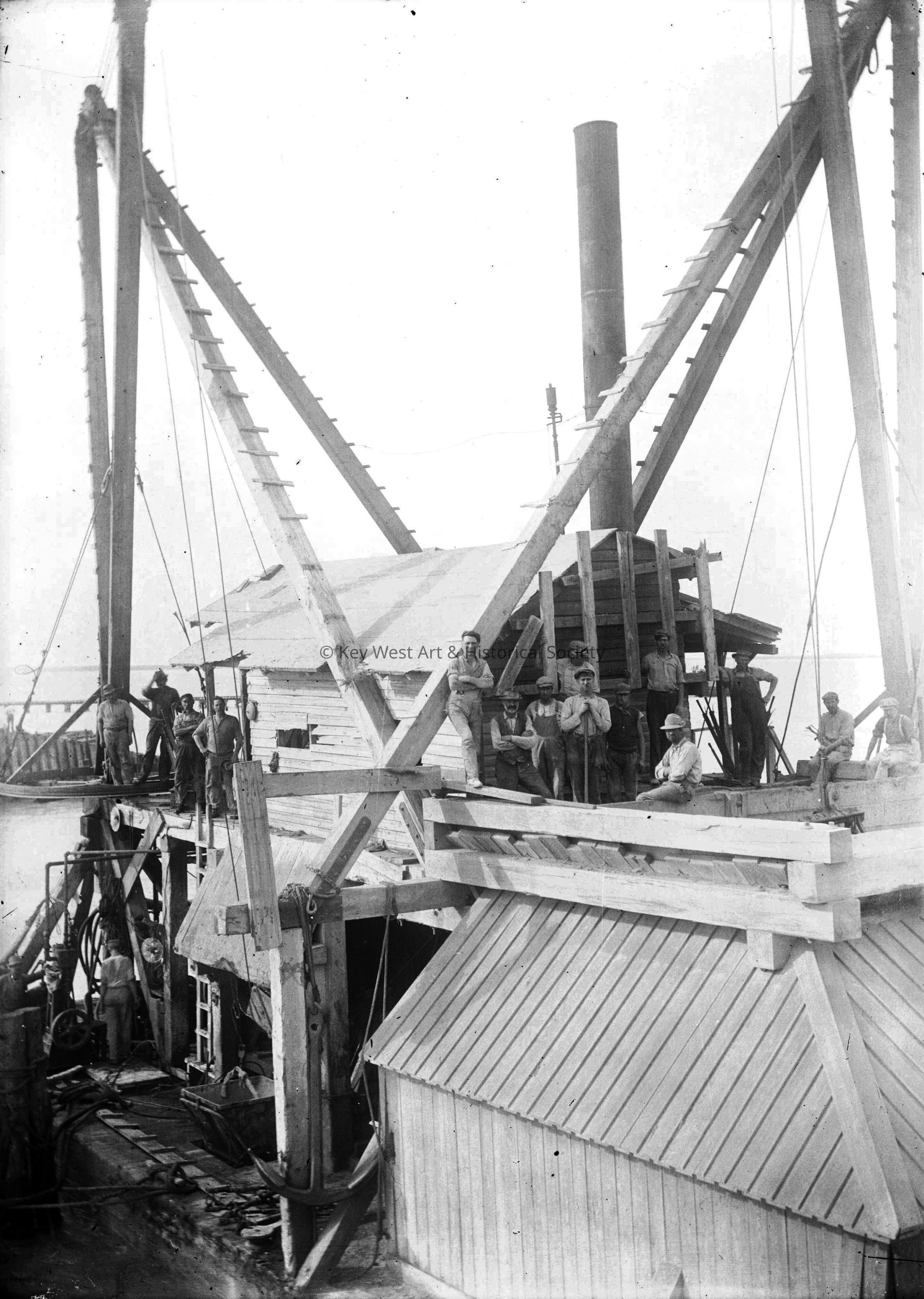 Black and white dry plate glass negative of a floating concrete mixer used by the Florida East Coast Railway during the construction of Seven Mile Bridge on the Overseas Railway.