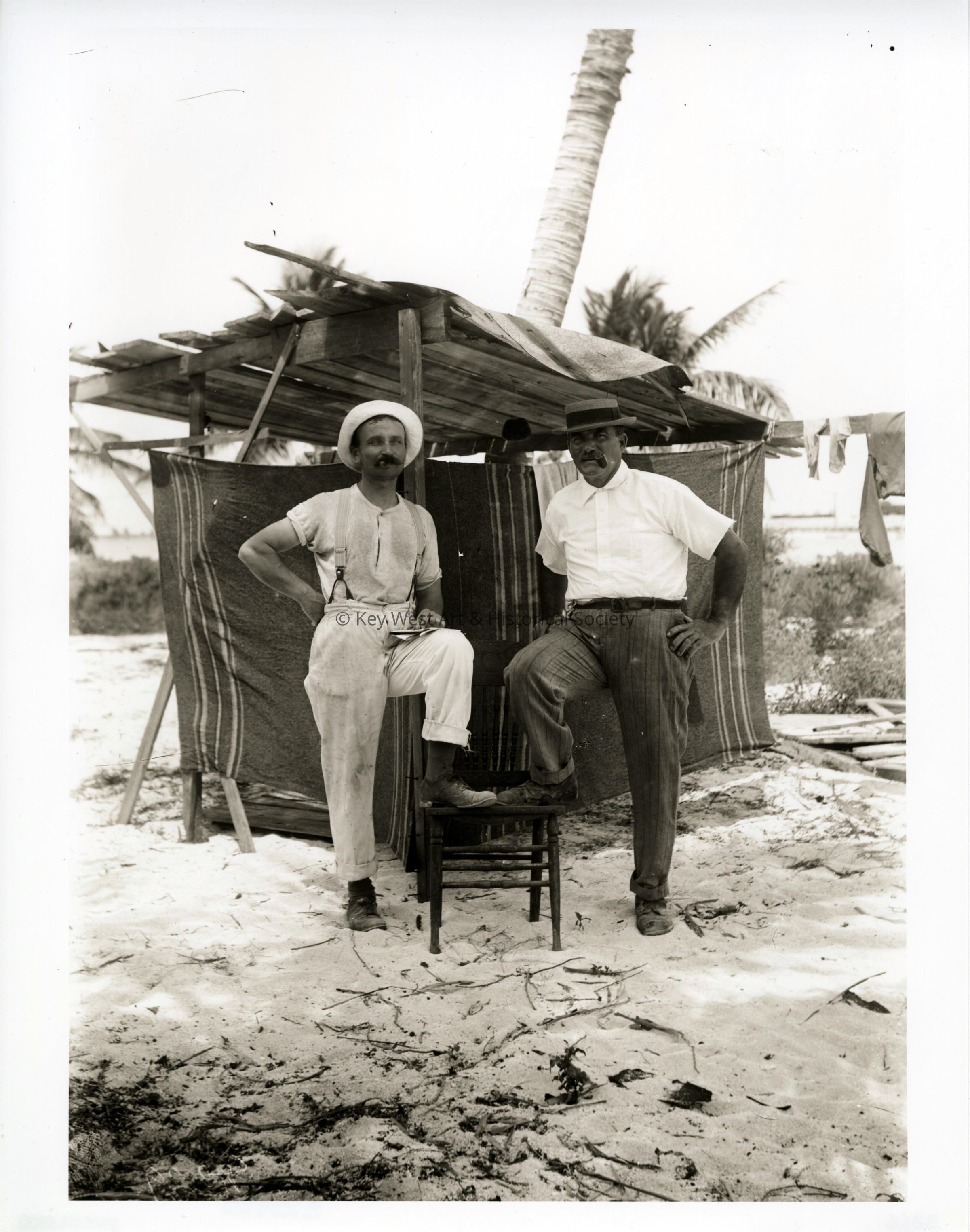 Black and white print taken from a dry plate glass negative of two unknown men standing in front of the shower stall at the Pigeon Key railroad camp. The image was taken during the construction of Seven Mile Bridge on the Overseas Railway.